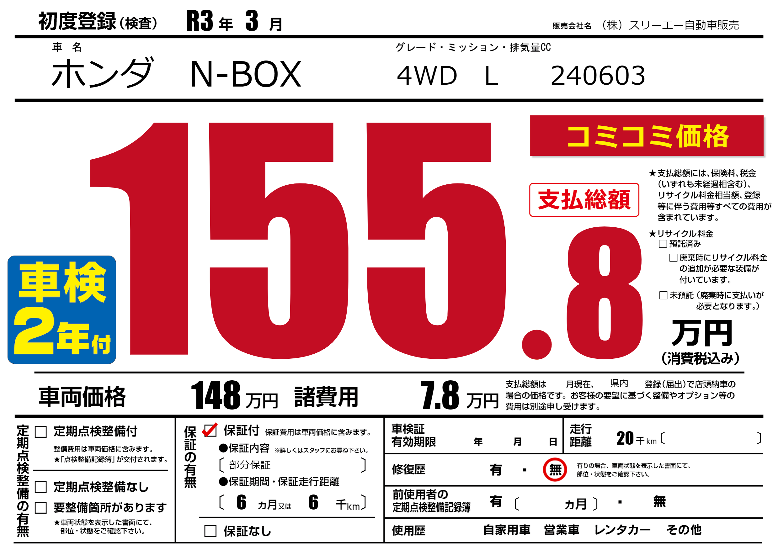 | 車名 | ホンダ N-BOX | グレード ミッション 排気量 |