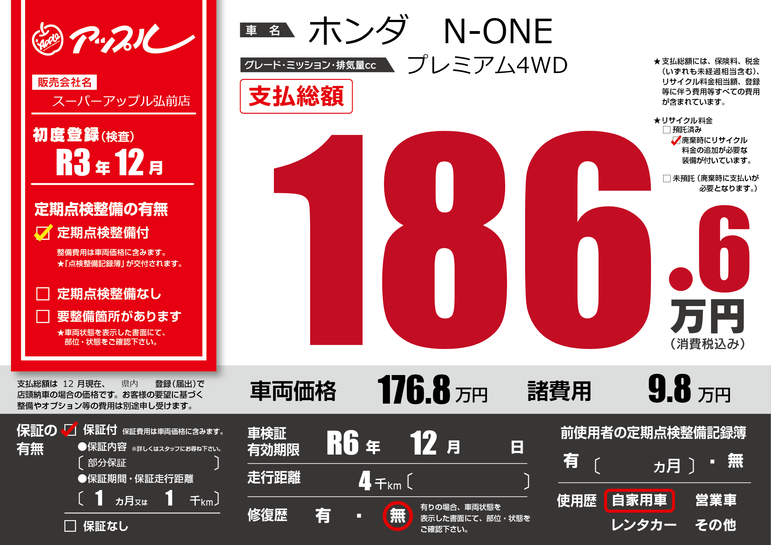 | 走行キロ | 0.4万km | 初年度登録 | R3年12月 |