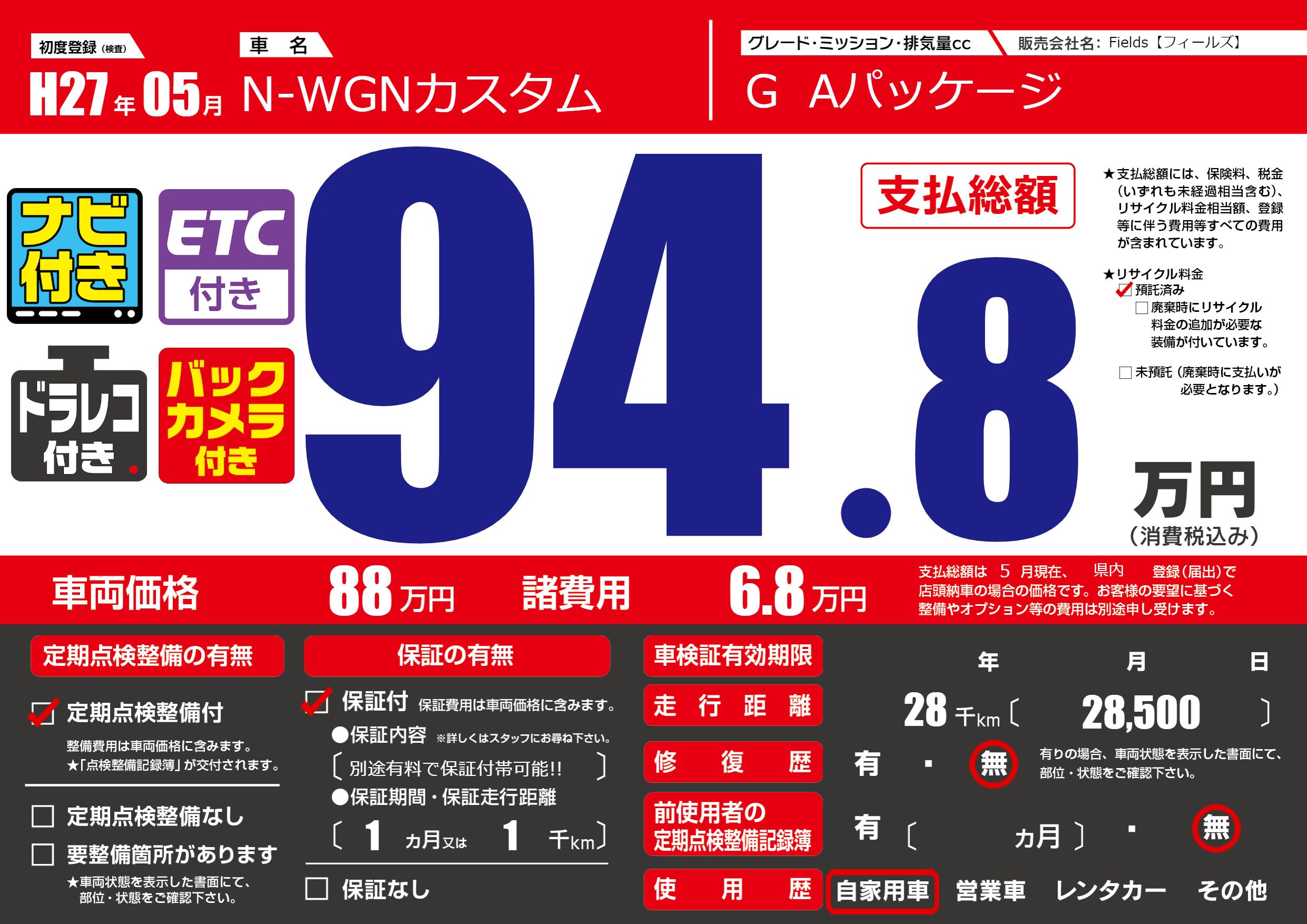 | 走行キロ | 2.8万km | 初年度登録 | H27年05月 |