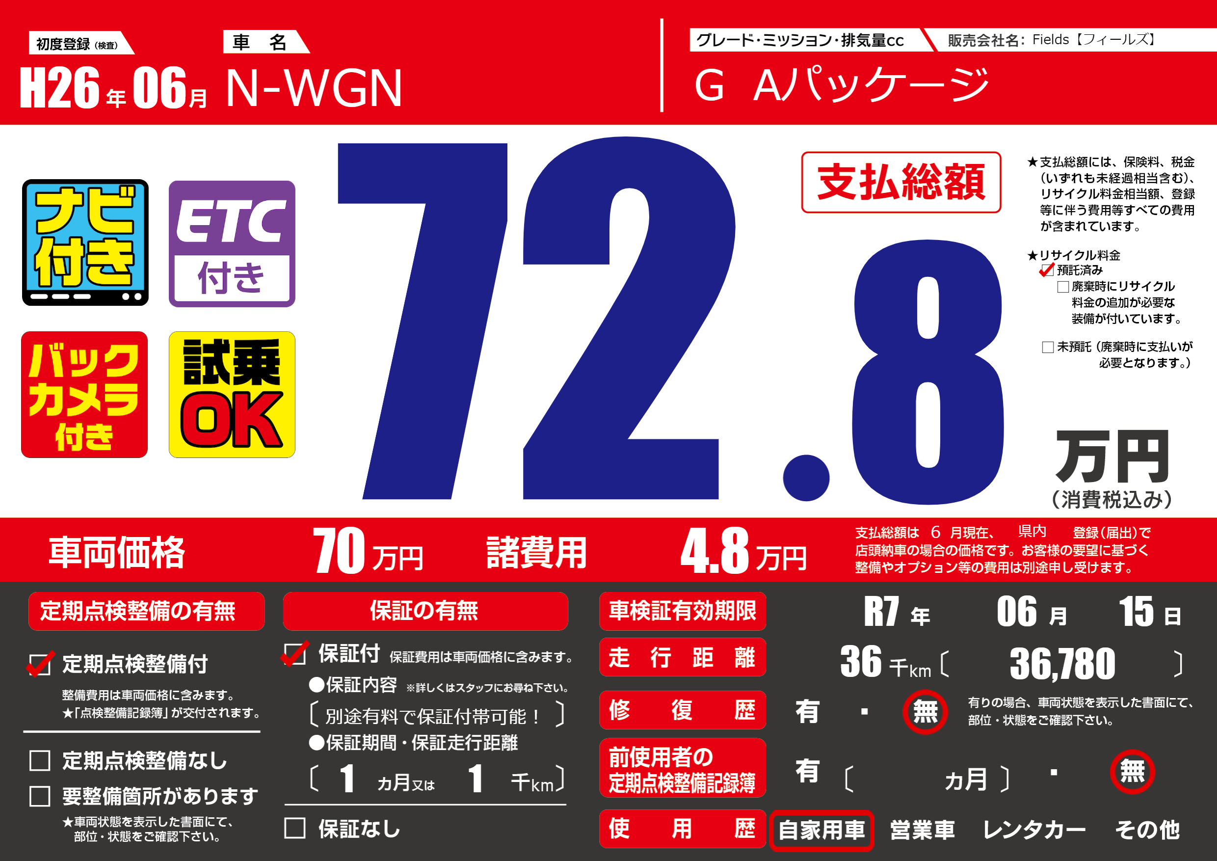 | 車名 | N-WGN | グレード ミッション 排気量 |