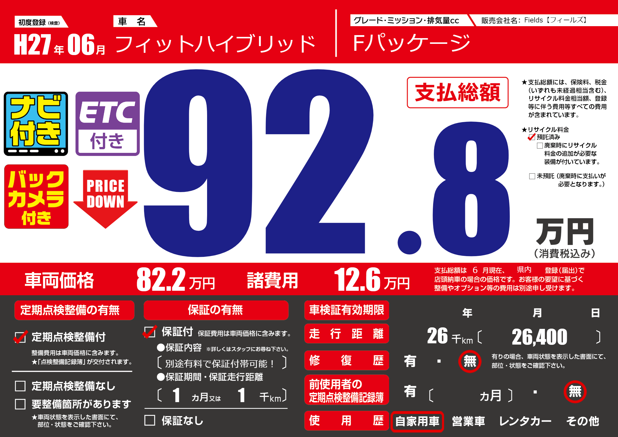 | 走行キロ | 2.6万km | 初年度登録 | H27年06月 |