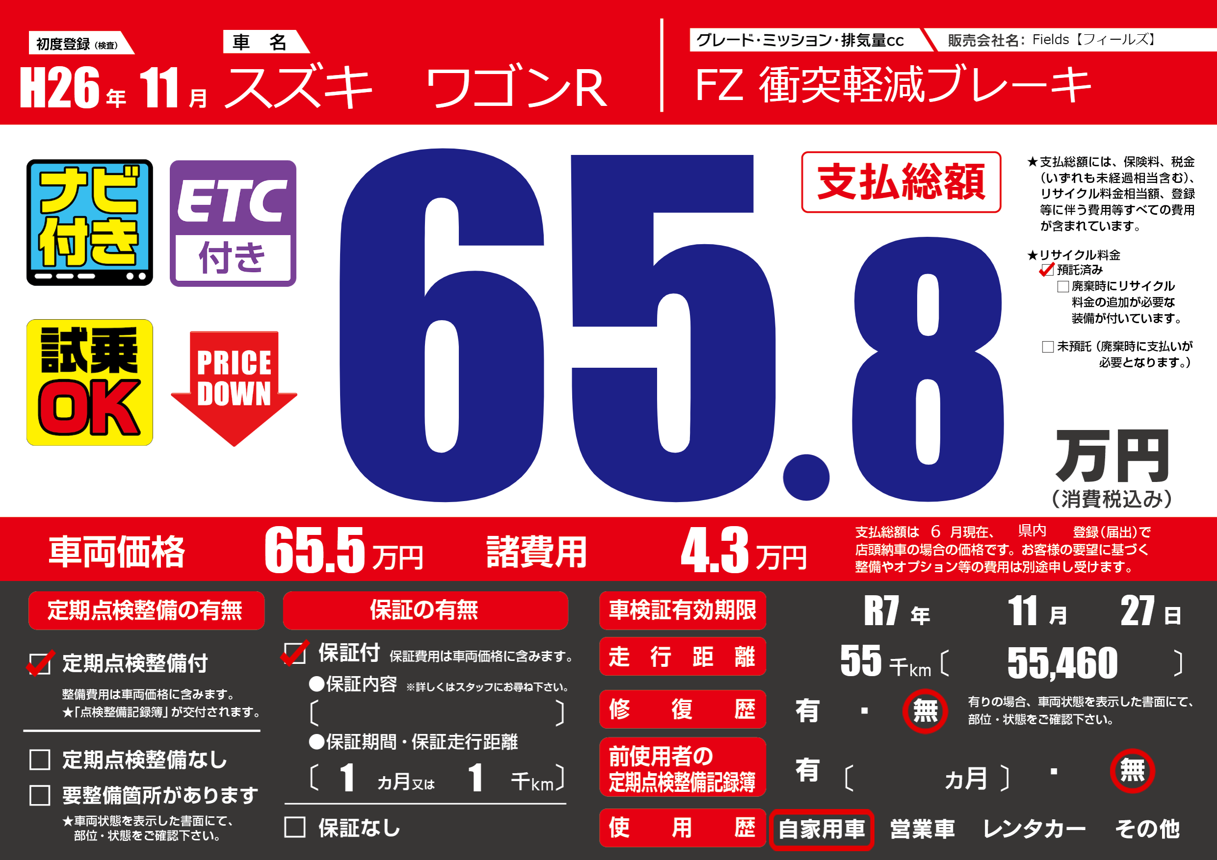 | 走行キロ | 5.5万km | 初年度登録 | H26年11月 |