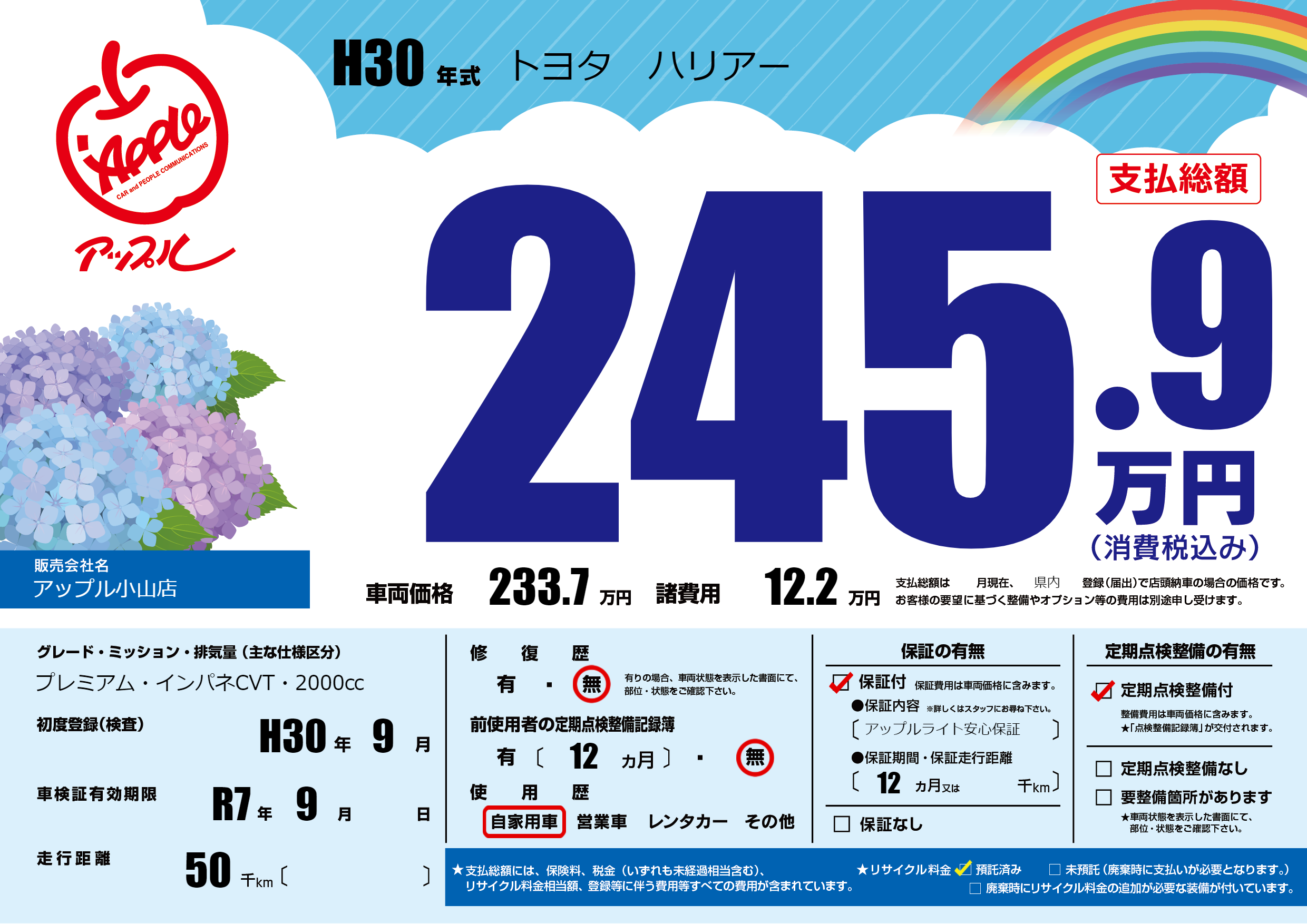 | 走行キロ | 5万km | 初年度登録 | H30年9月 |