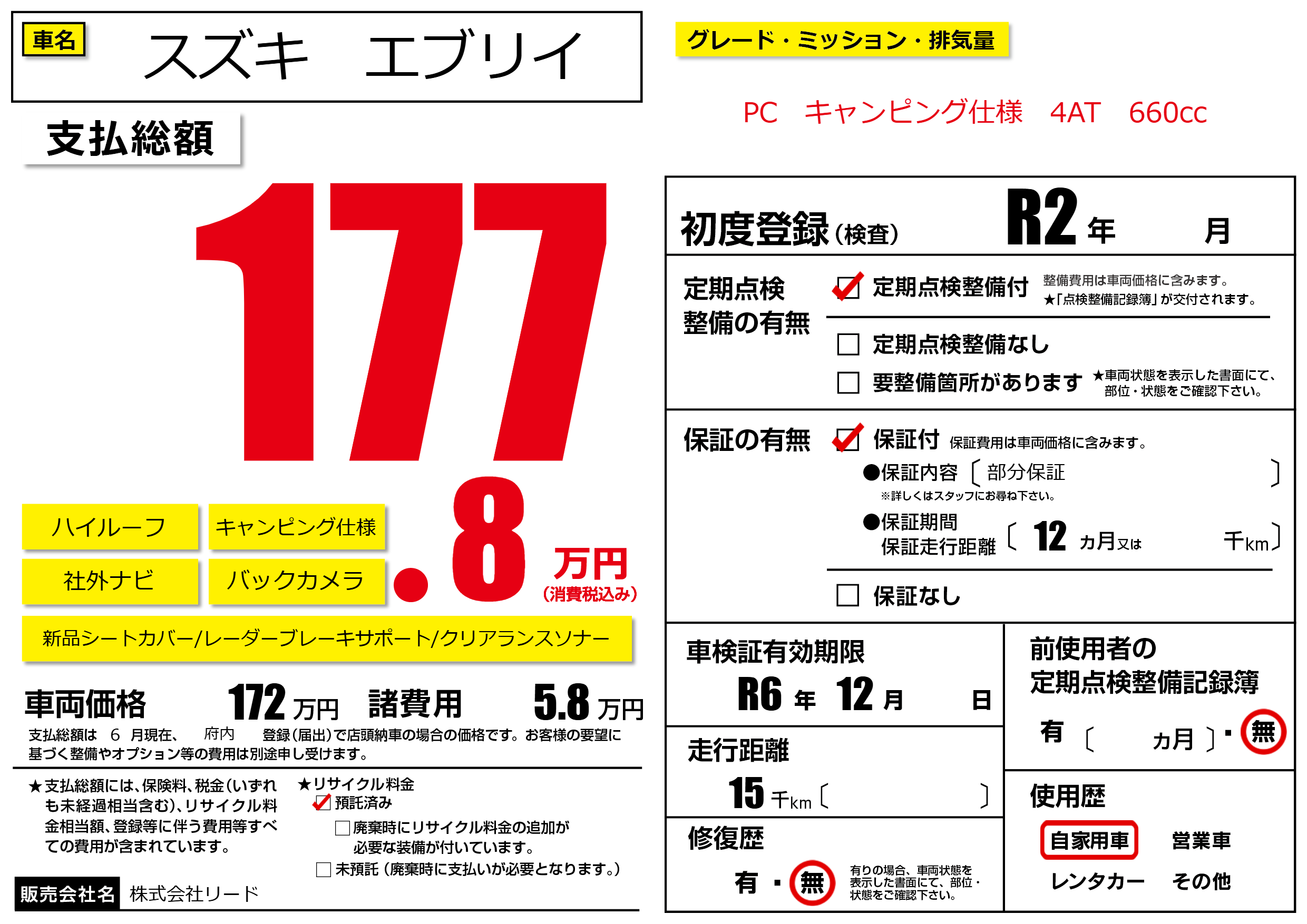 なし | 車検制限 | R6年12月---月 |