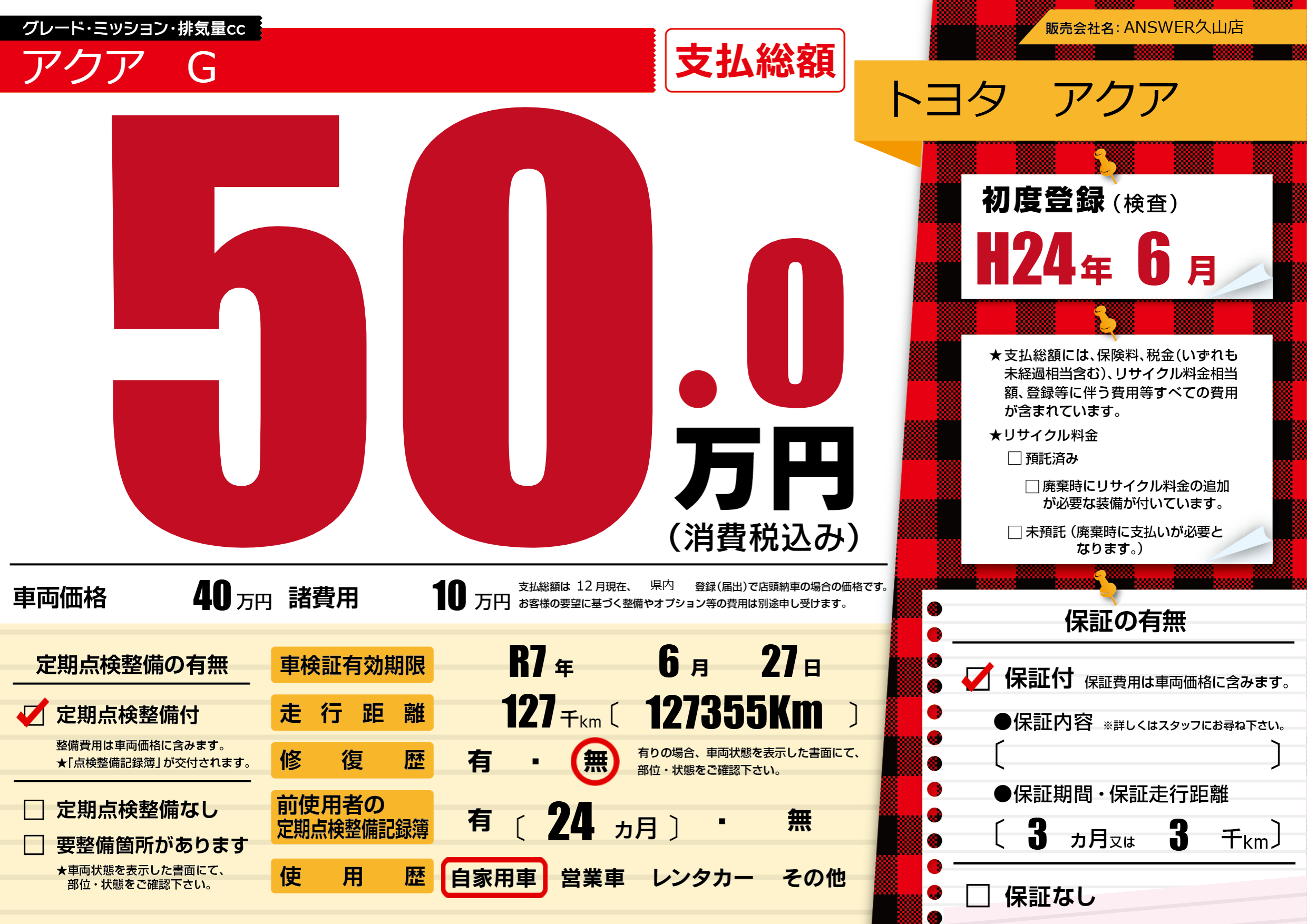 なし | 車検制限 | R7年6月27月 |