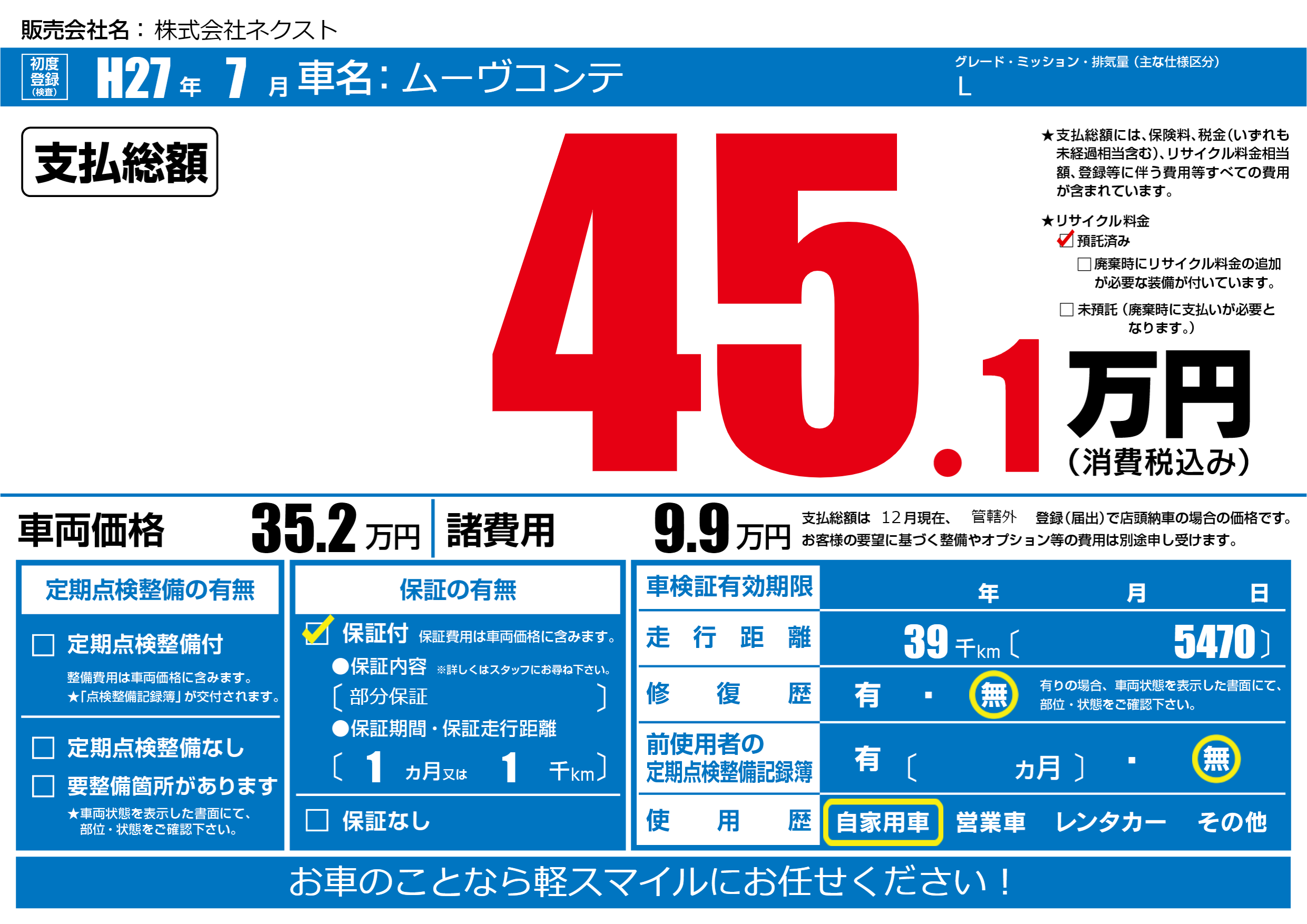 | 車名 | ムーヴコンテ | グレード ミッション 排気量 |