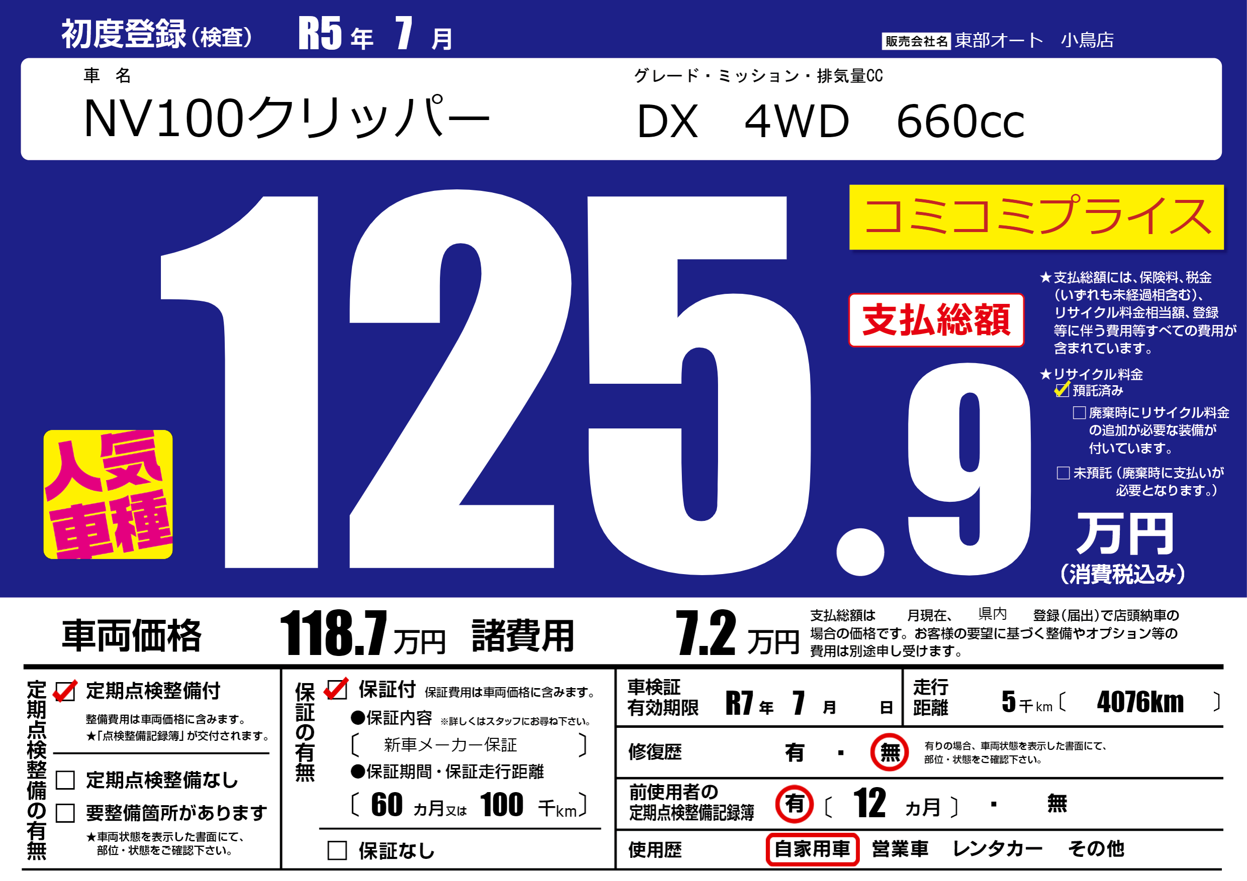 保証付き 保証内容( 新車メーカー保証) 60ヶ月または(100)千kmまで |