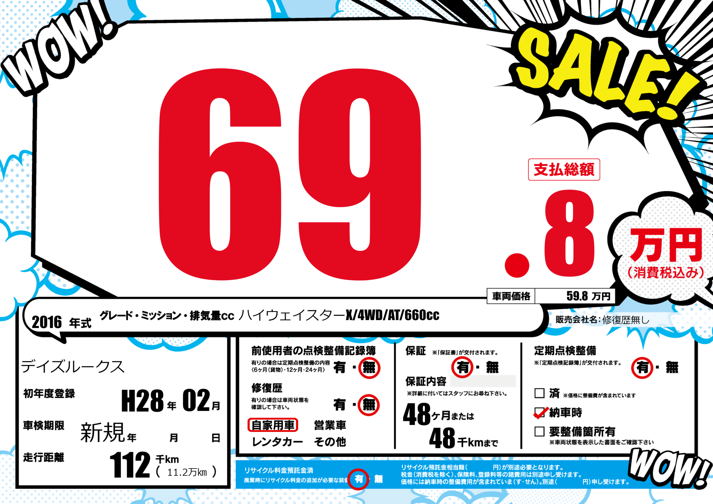 | 走行キロ | 11.2万km | 初年度登録 | H28年02月 |