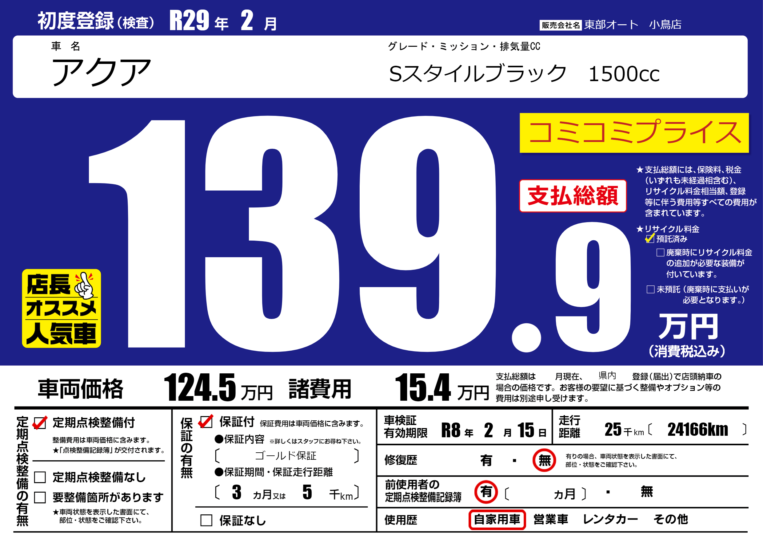 あり | リサイクル預託金相当額 | ( 0円)が別途必要 |