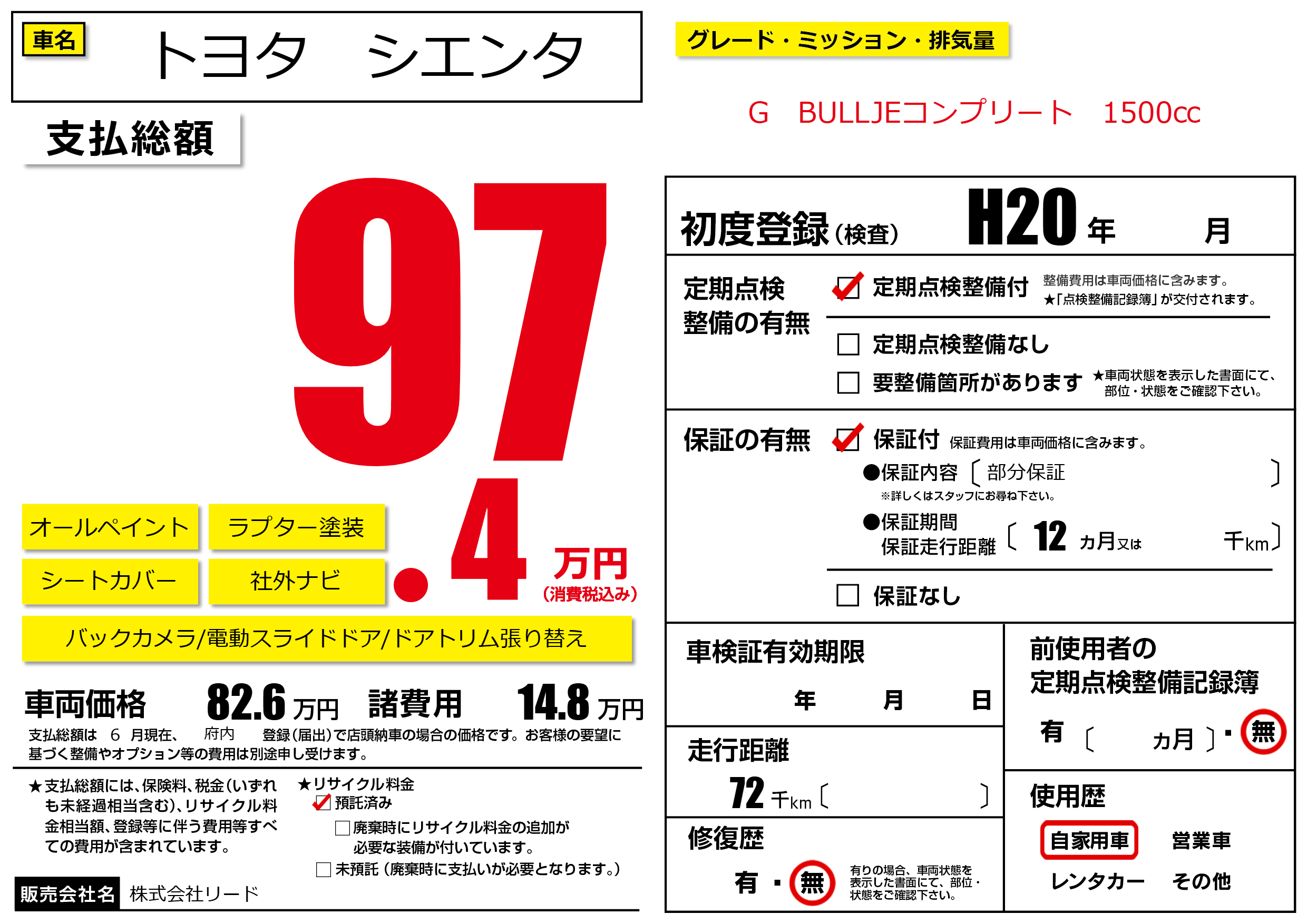 | 車名 | トヨタ シエンタ | グレード ミッション 排気量 |