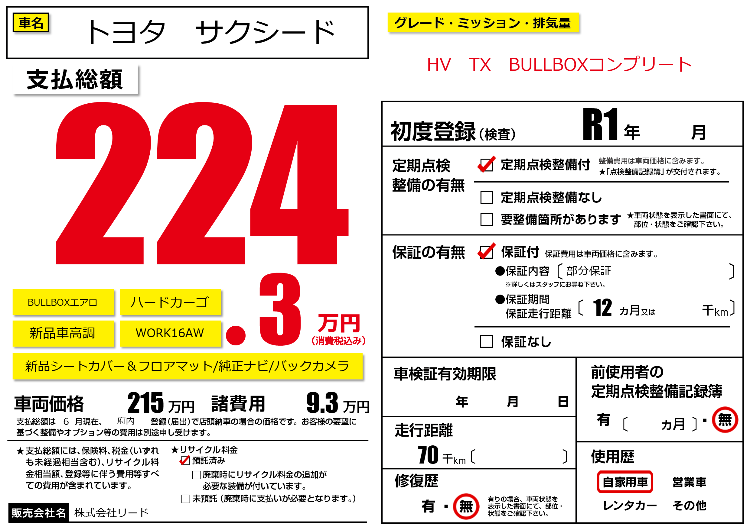 | 車名 | トヨタ サクシード | グレード ミッション 排気量 |