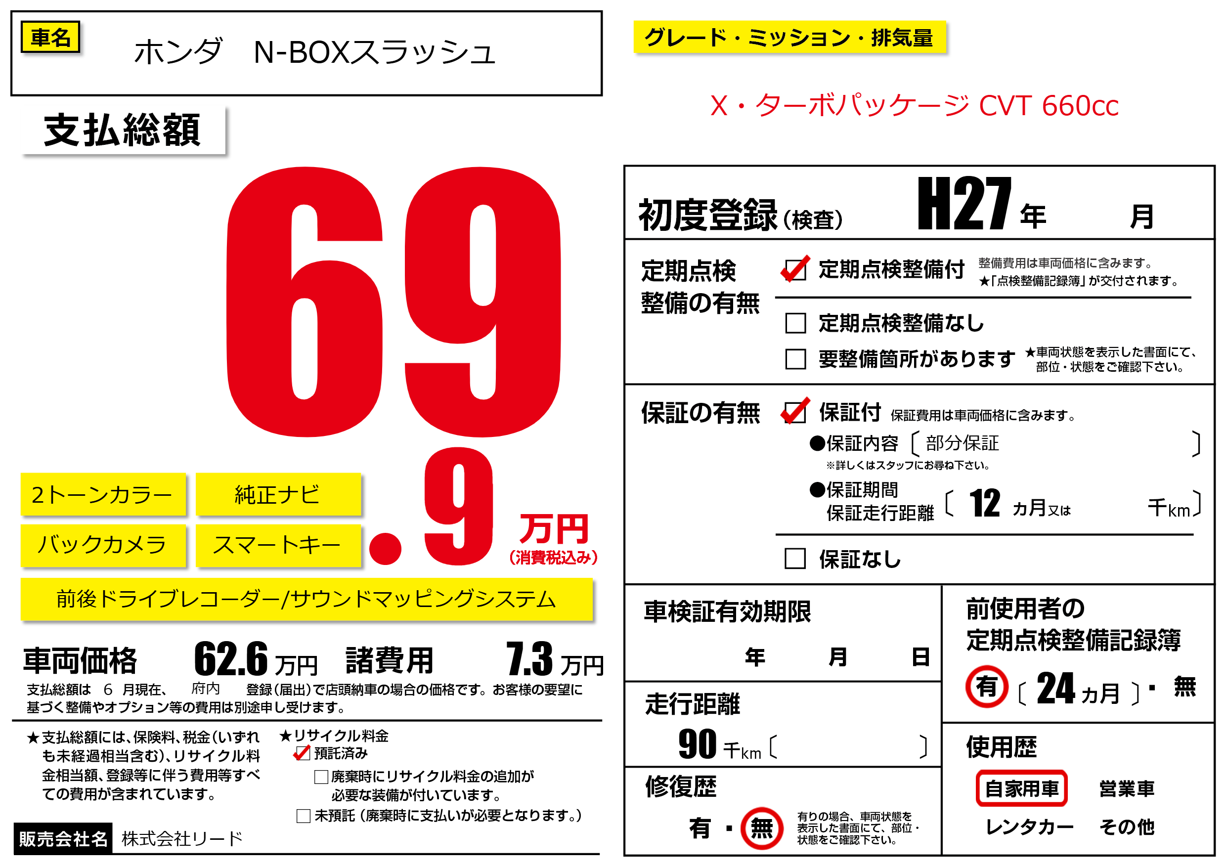 | 車名 | ホンダ N-BOXスラッシュ | グレード ミッション 排気量 |