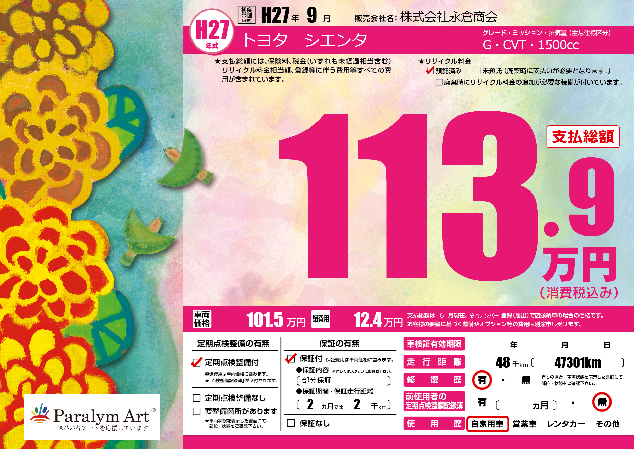 | 車名 | トヨタ シエンタ | グレード ミッション 排気量 |