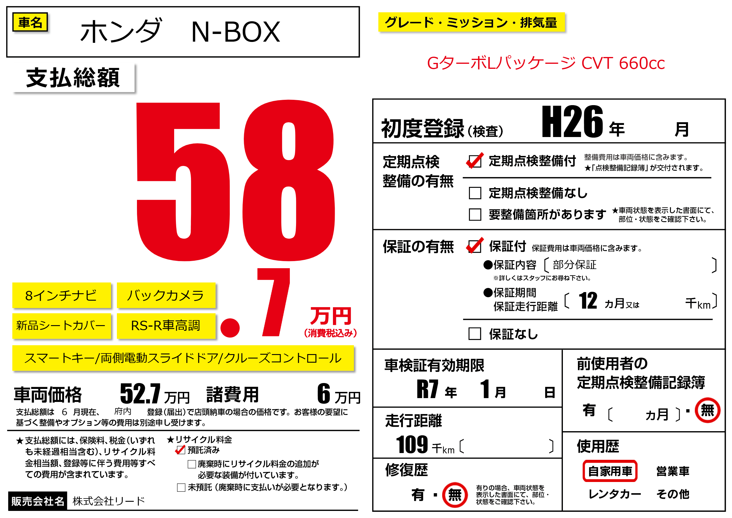 | 車検制限 | R7年 1月 - 日 | ||