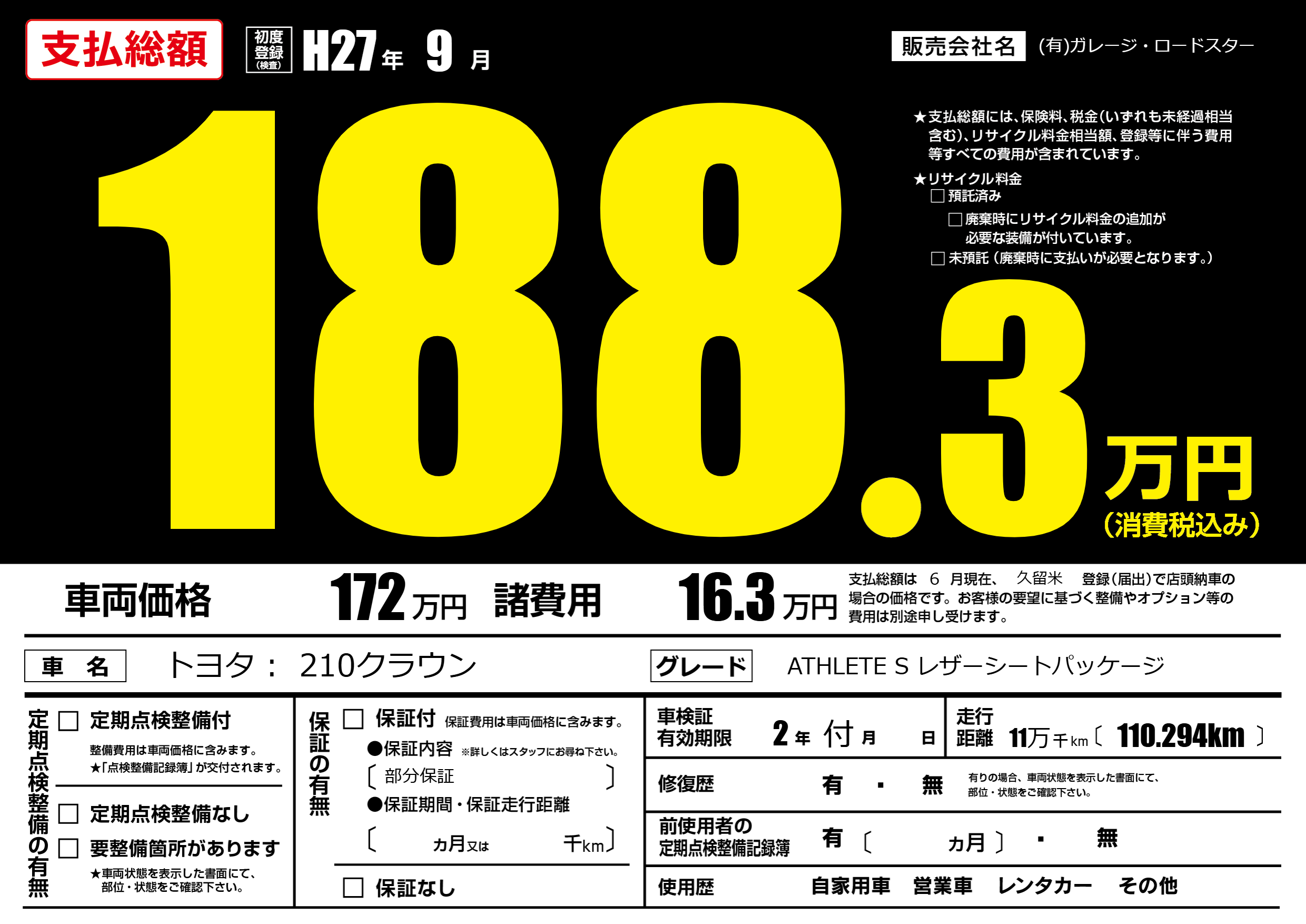 | 車名 | トヨタ : 210クラウン | グレード ミッション 排気量 |