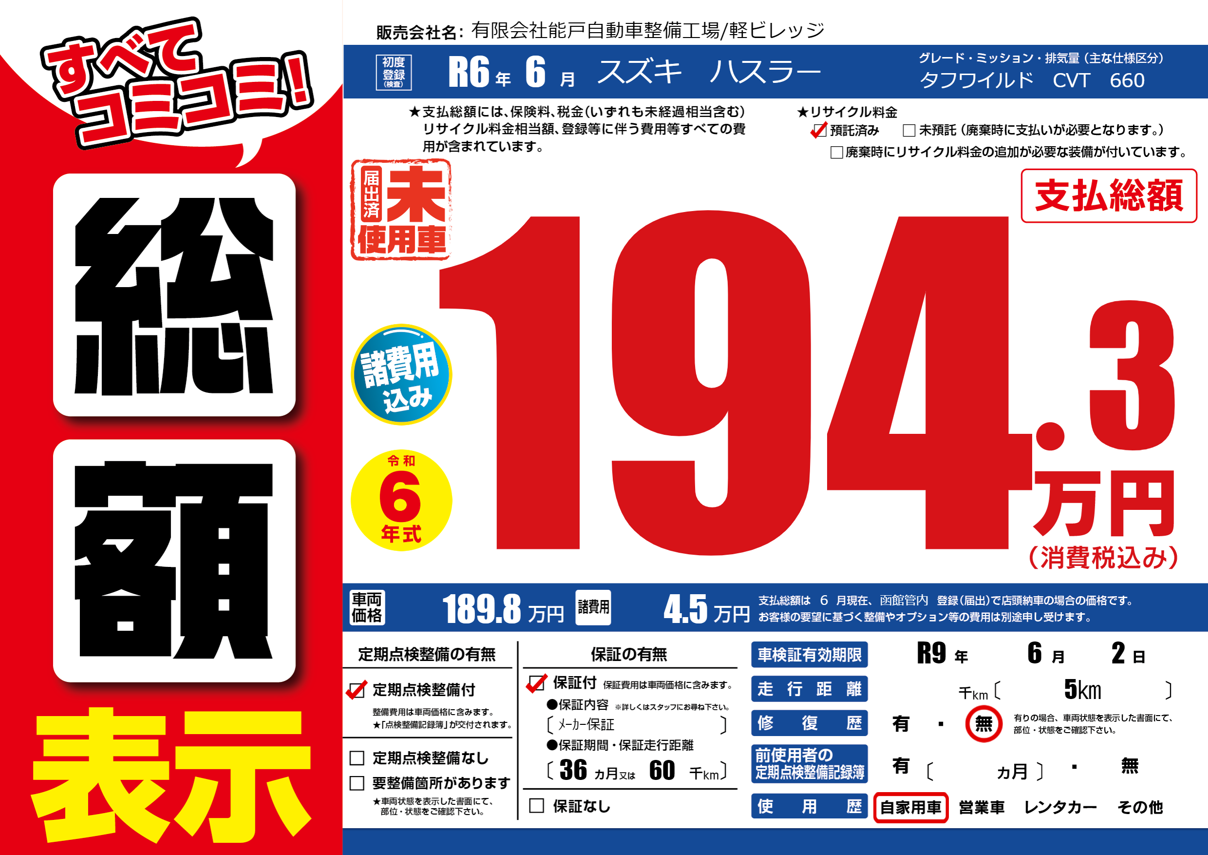 | 車名 | スズキ ハスラー | グレード ミッション 排気量 |