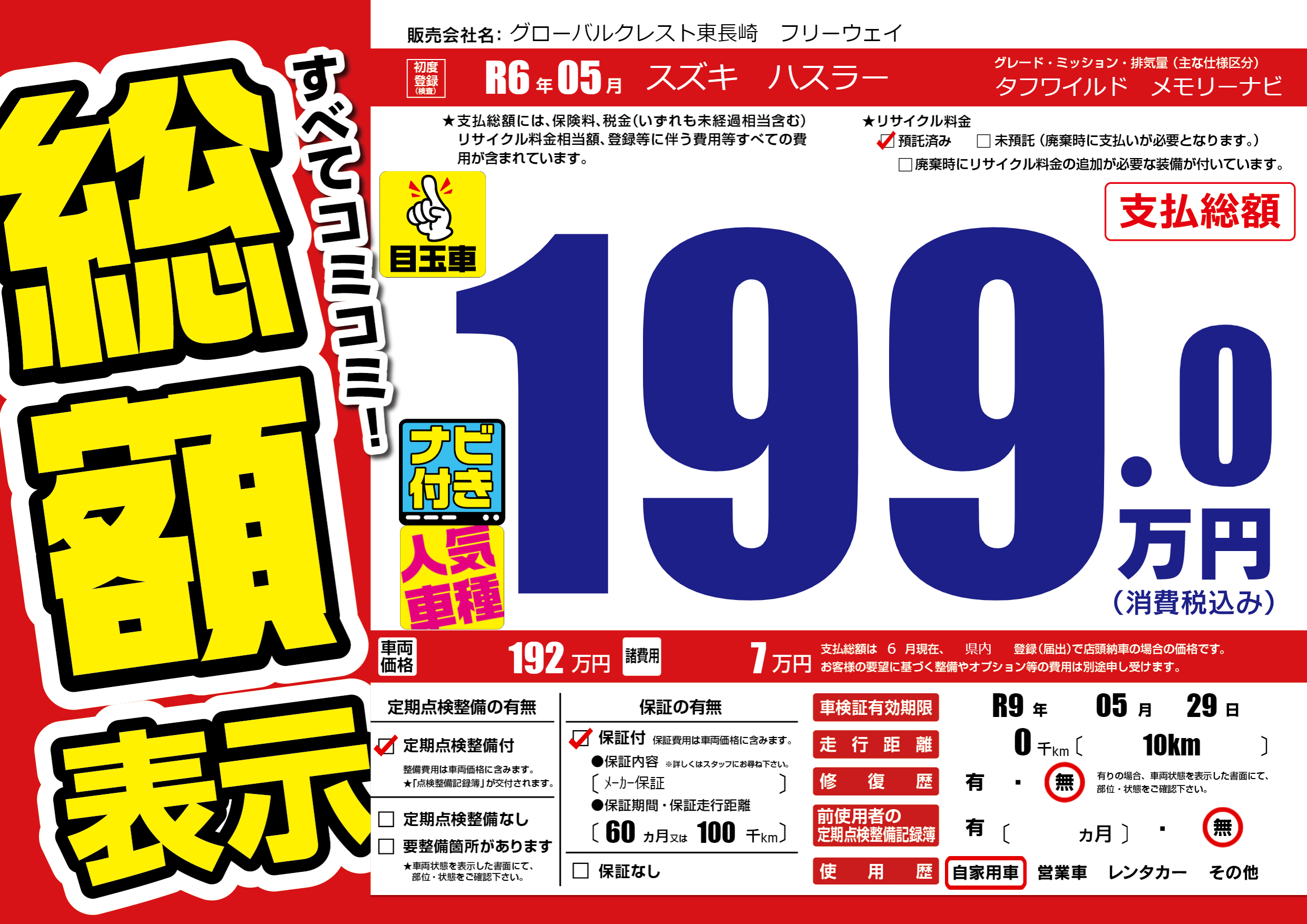 | 車名 | スズキ ハスラー | グレード ミッション 排気量 |