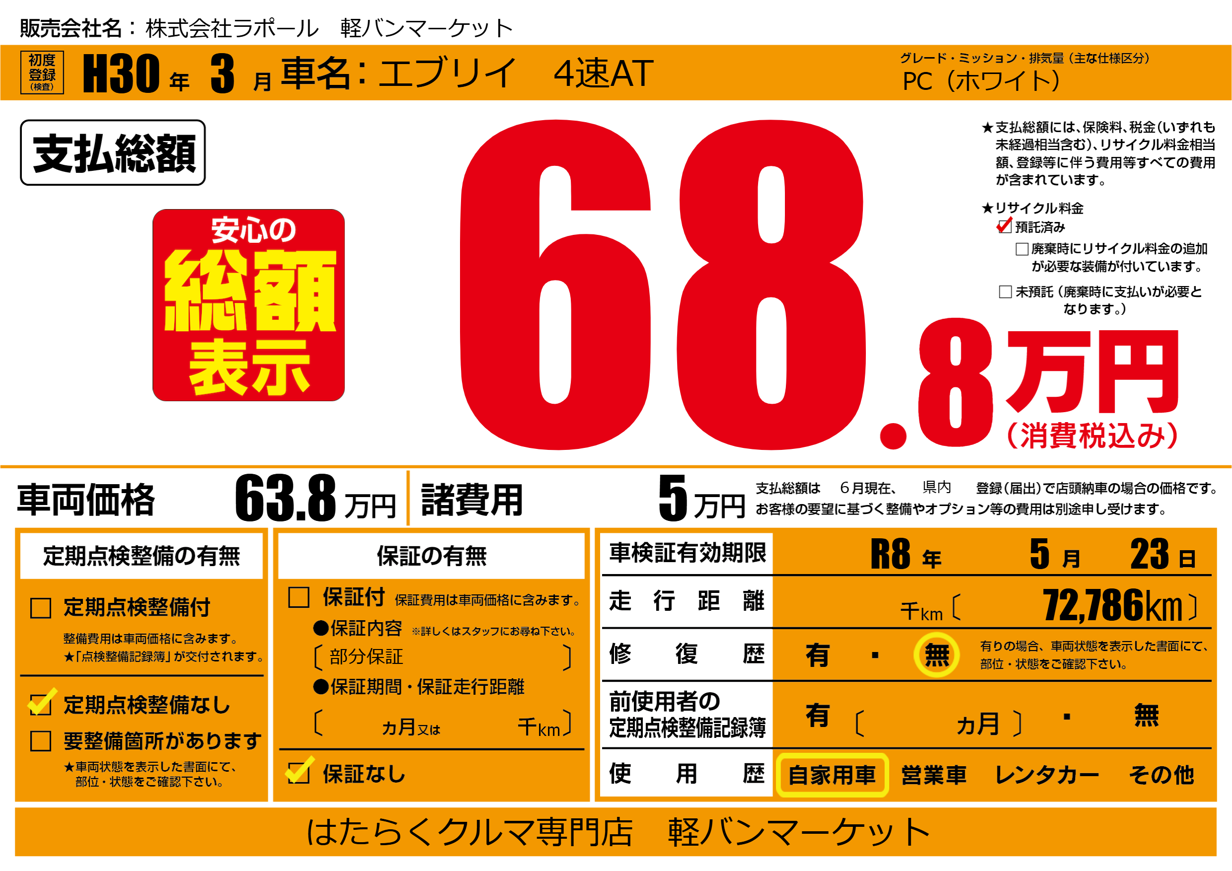 | 車名 | エブリイ 4速AT | グレード ミッション 排気量 |