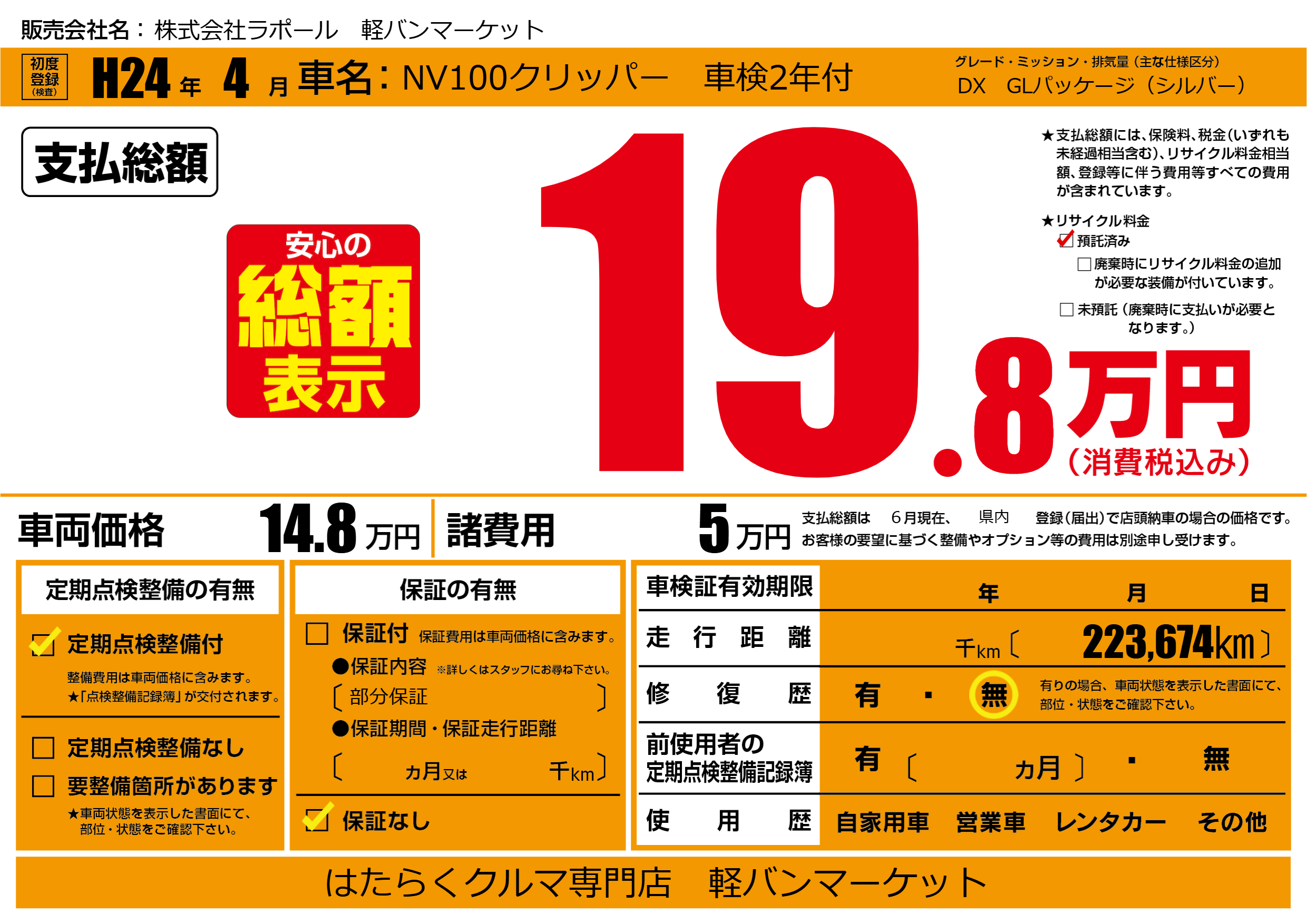 | 車名 | NV100クリッパー 車検2年付 | グレード ミッション 排気量 |