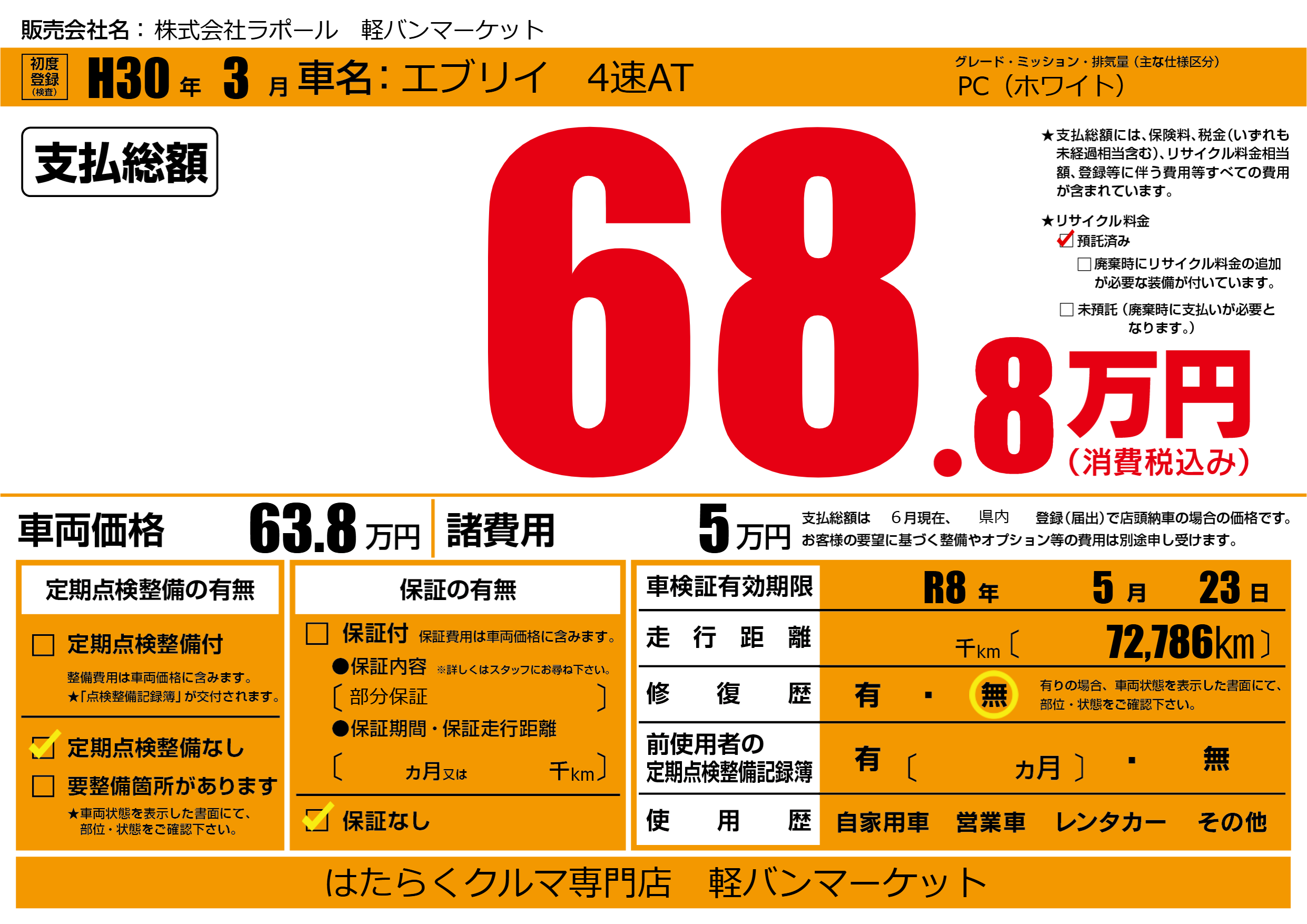 | 走行キロ | - | 初年度登録 | H30年3月 |
