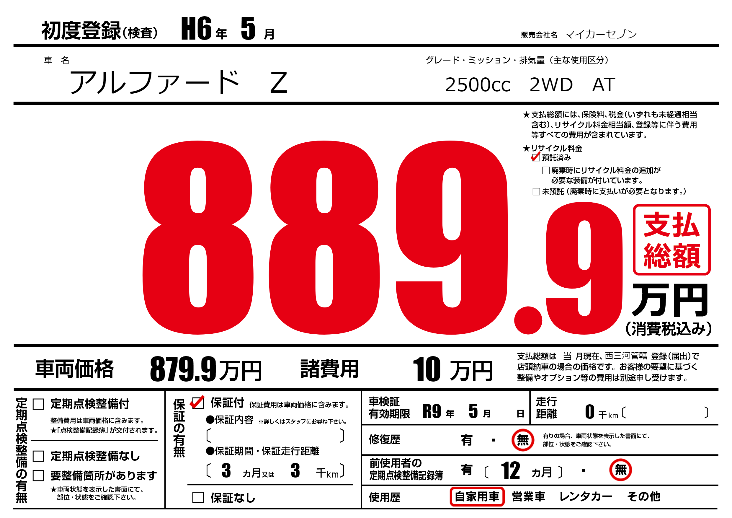 | 車名 | アルファード Z | グレード ミッション 排気量 |