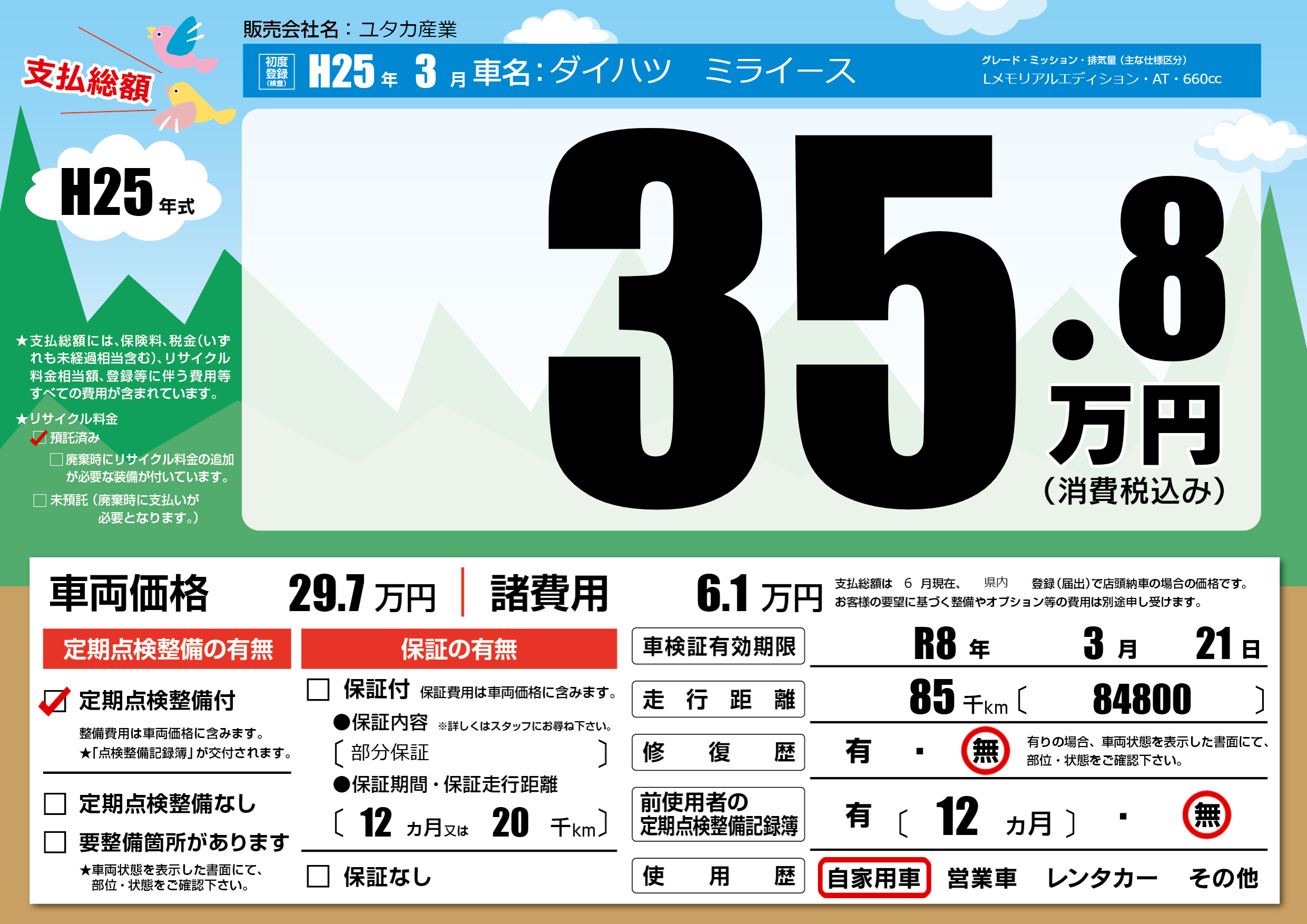 | 走行キロ | 8.5万km | 初年度登録 | H25年3月 |