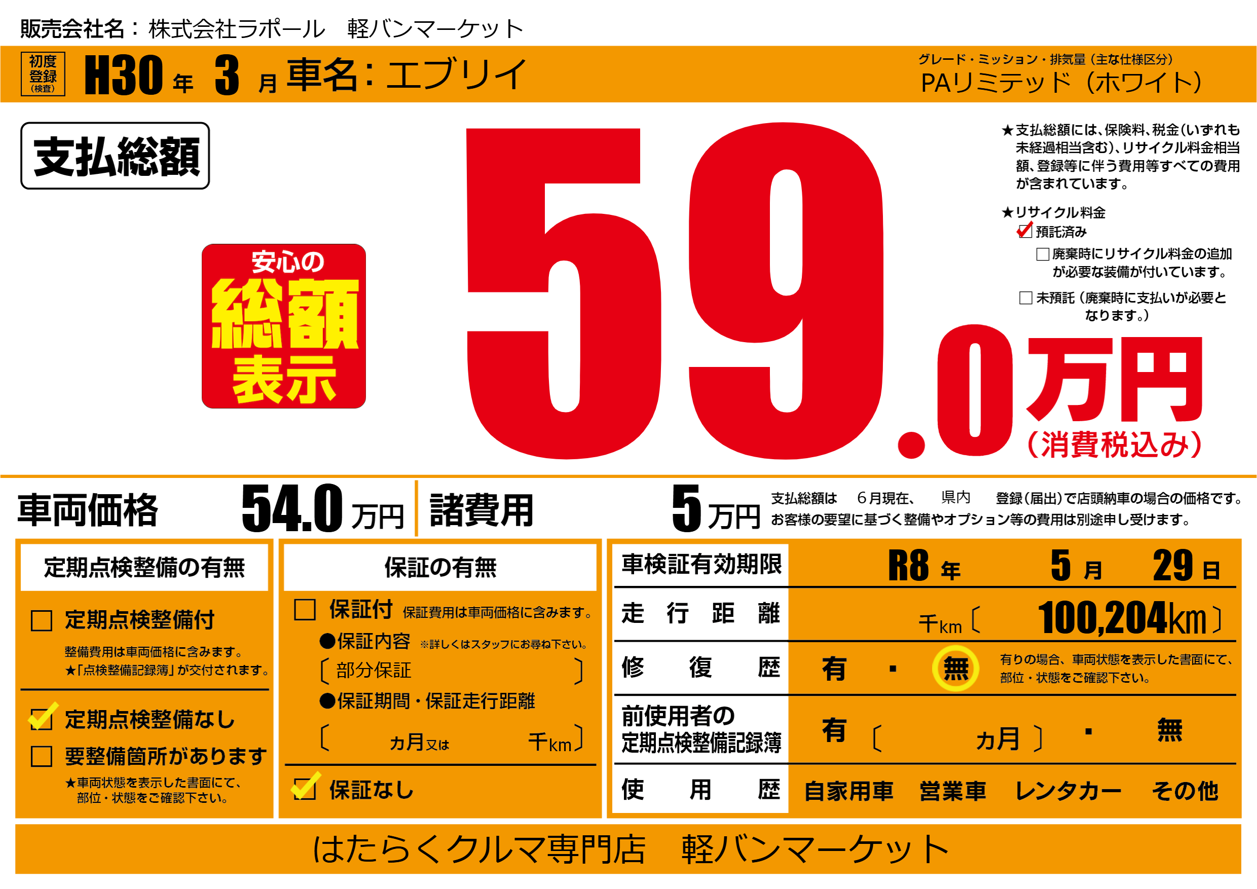 なし | 車検制限 | R8年5月29月 |