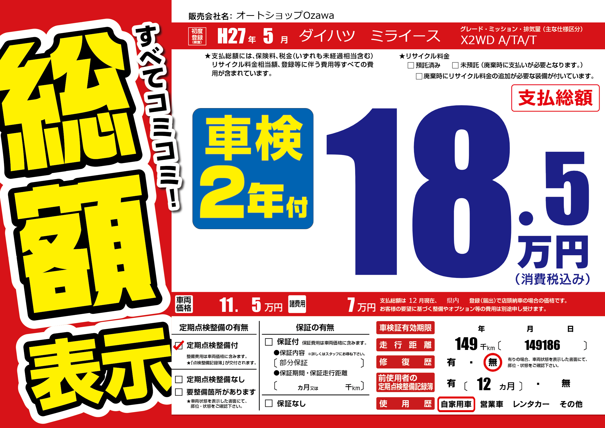 | 走行キロ | 14.9万km | 初年度登録 | H27年5月 |