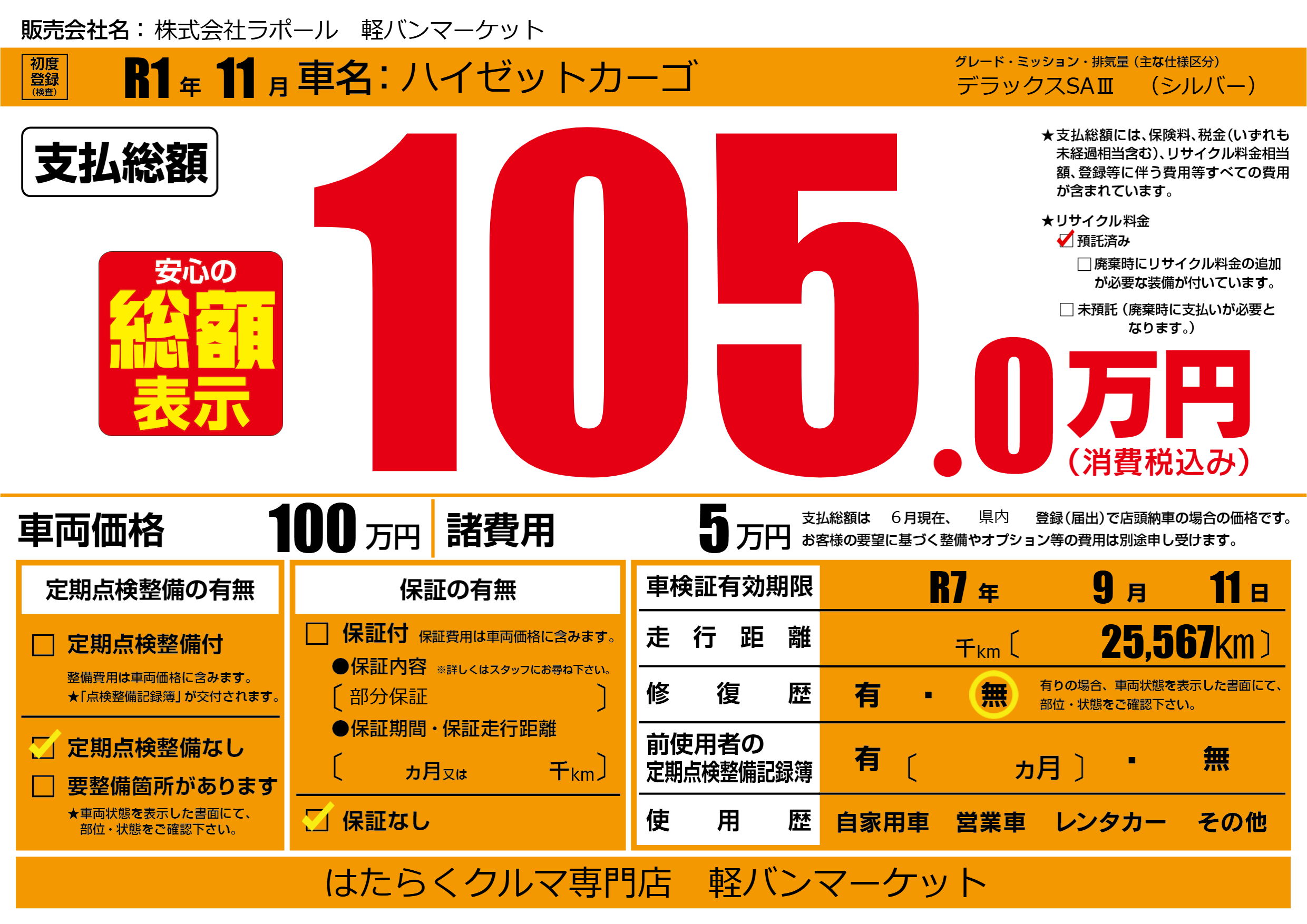 | 車名 | ハイゼットカーゴ | グレード ミッション 排気量 |