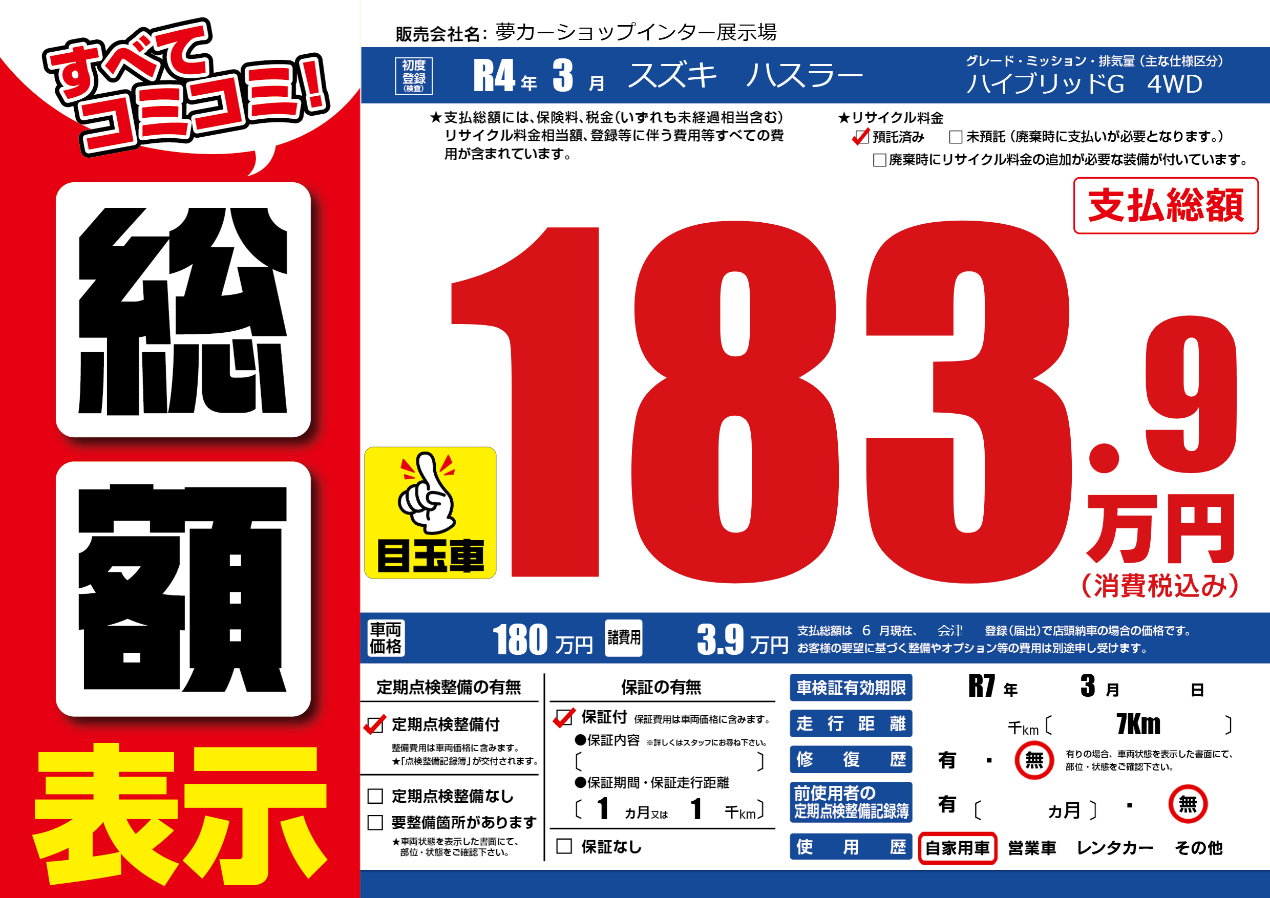 | 車検制限 | R7年 3月 - 日 | ||