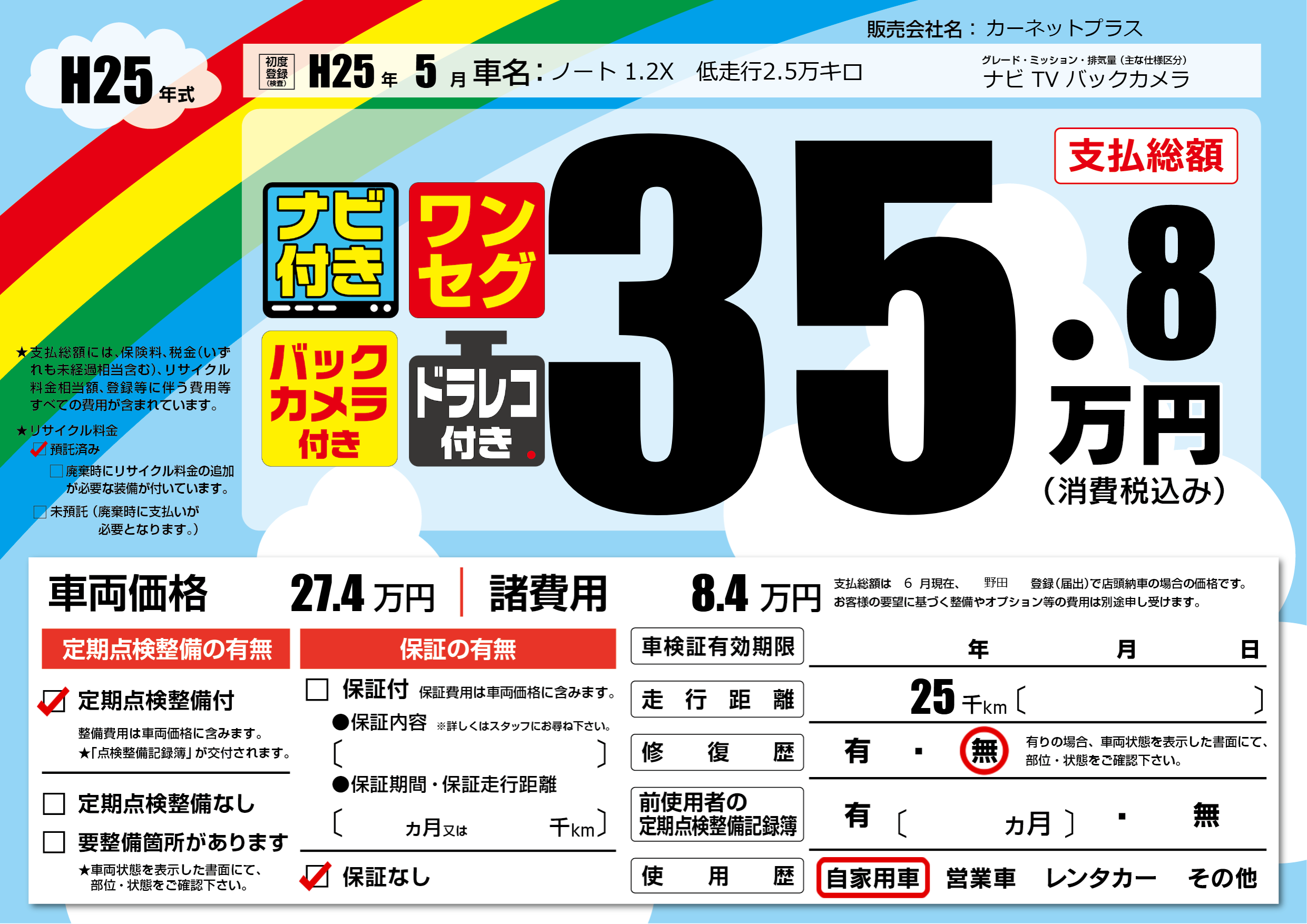 | 車名 | ノート 1.2X 低走行2.5万キロ | グレード ミッション 排気量 |