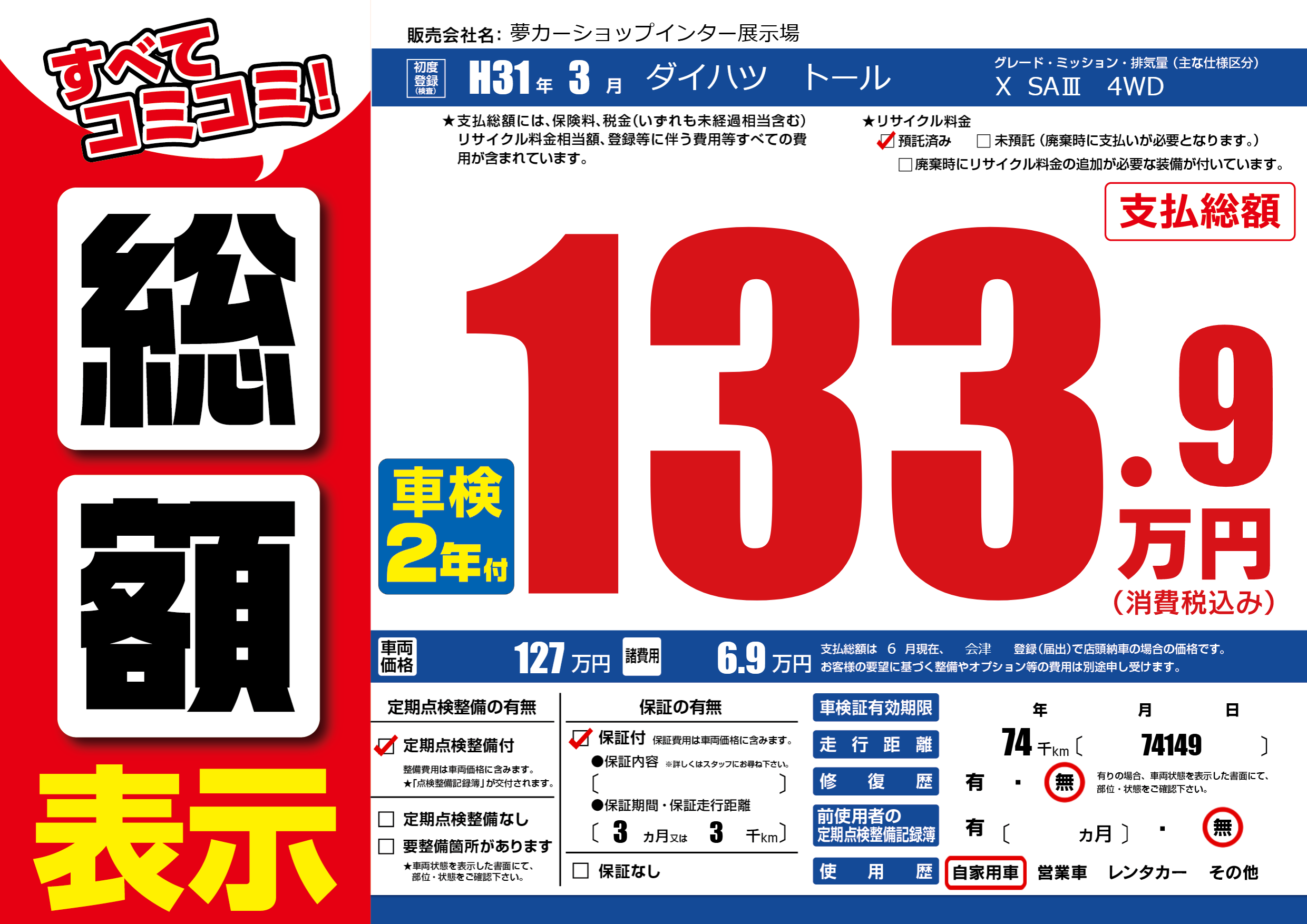 | 車名 | ダイハツ トール | グレード ミッション 排気量 |