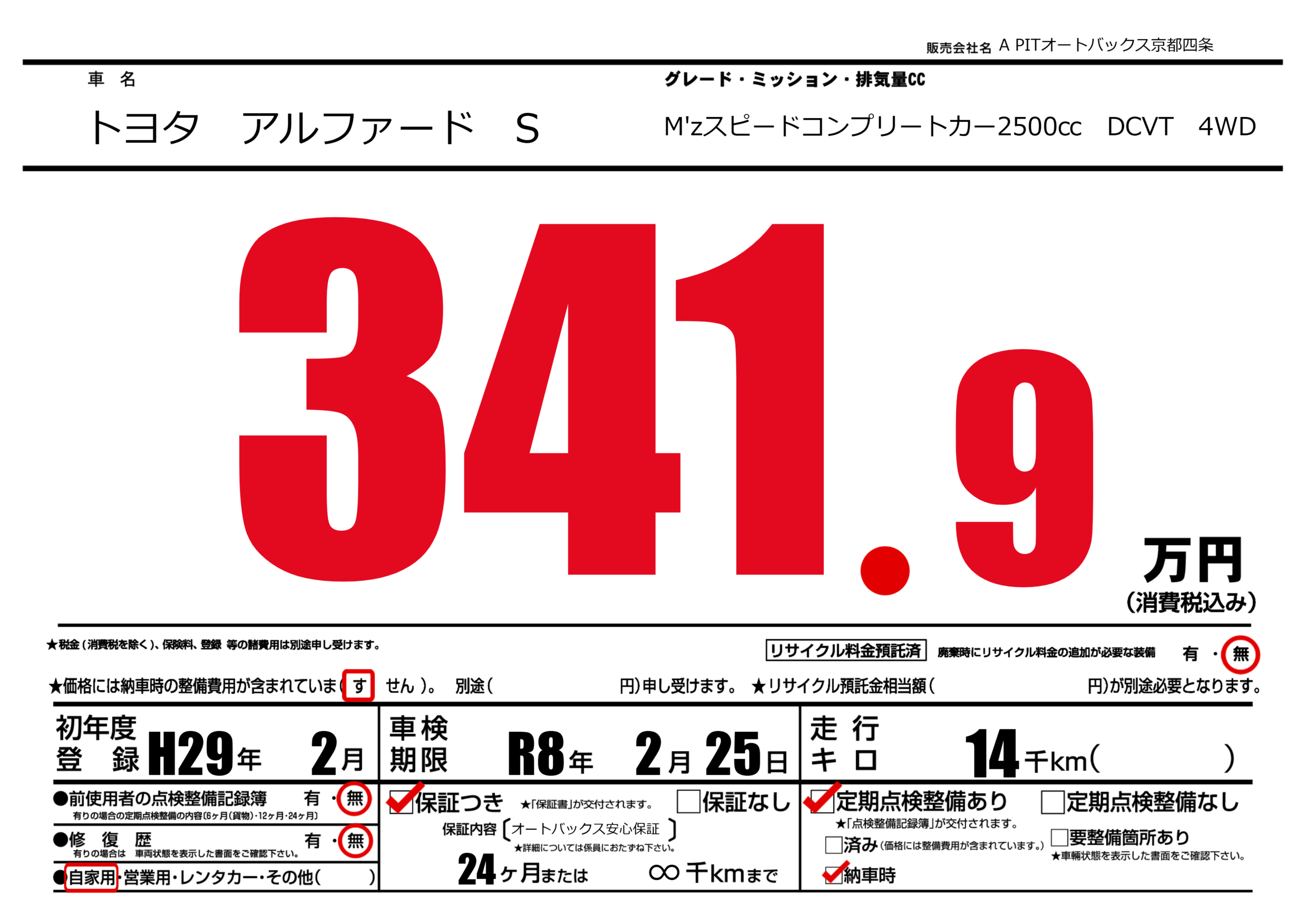 | 車名 | トヨタ アルファード S | グレード ミッション 排気量 |