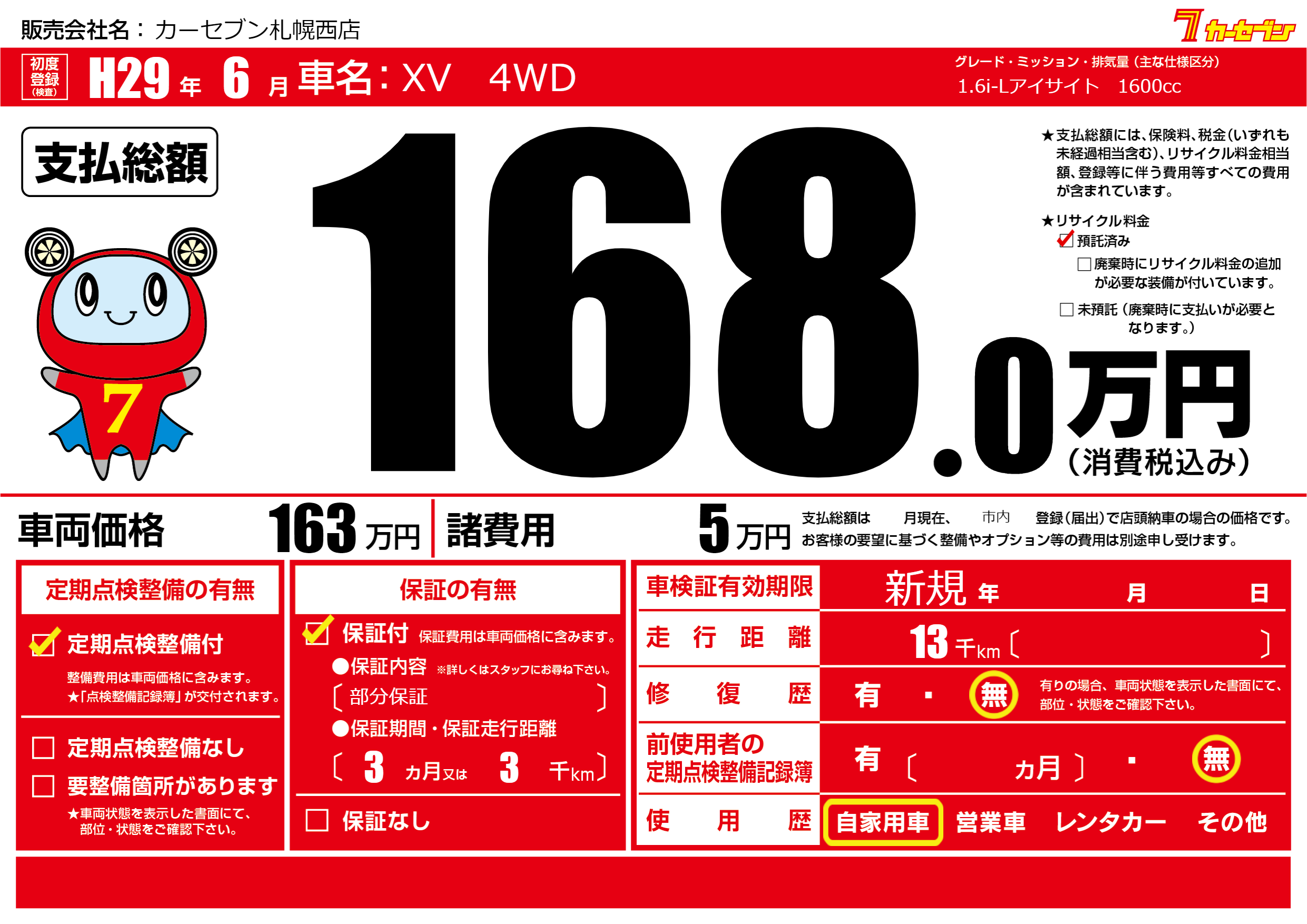 | 車名 | XV 4WD | グレード ミッション 排気量 |