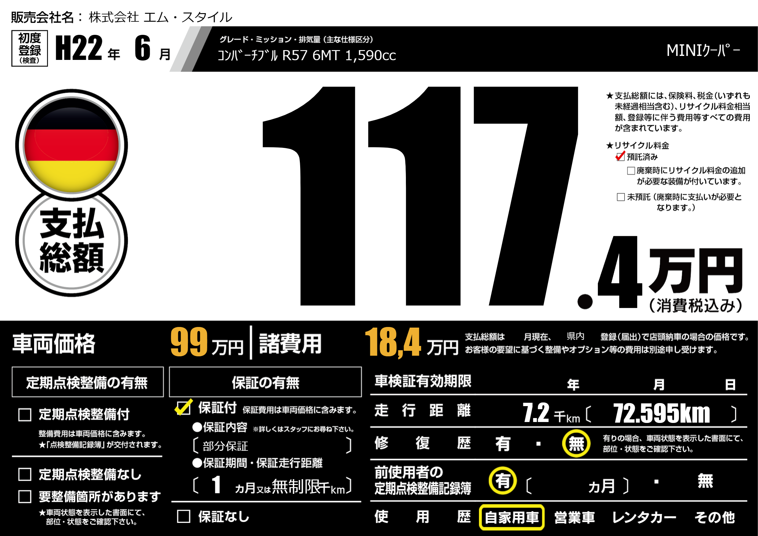 | 走行キロ | 0.7万km | 初年度登録 | H22年6月 |