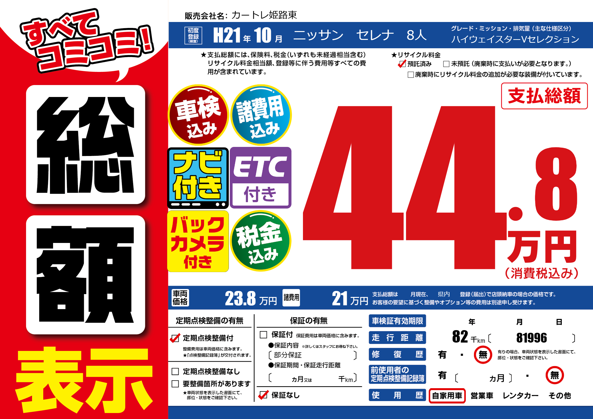 | 走行キロ | 8.2万km | 初年度登録 | H21年10月 |