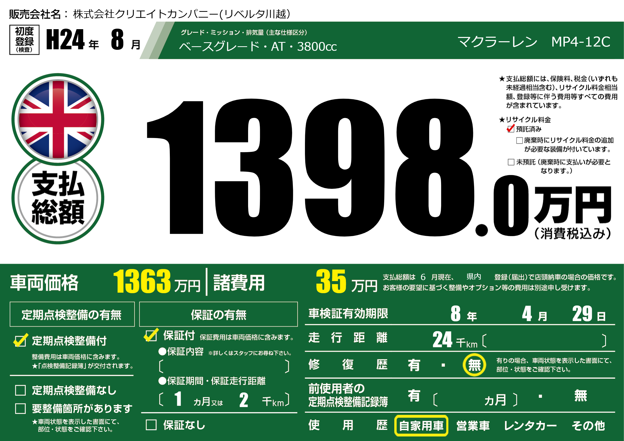 | 車名 | マクラーレン MP4-12C | グレード ミッション 排気量 |