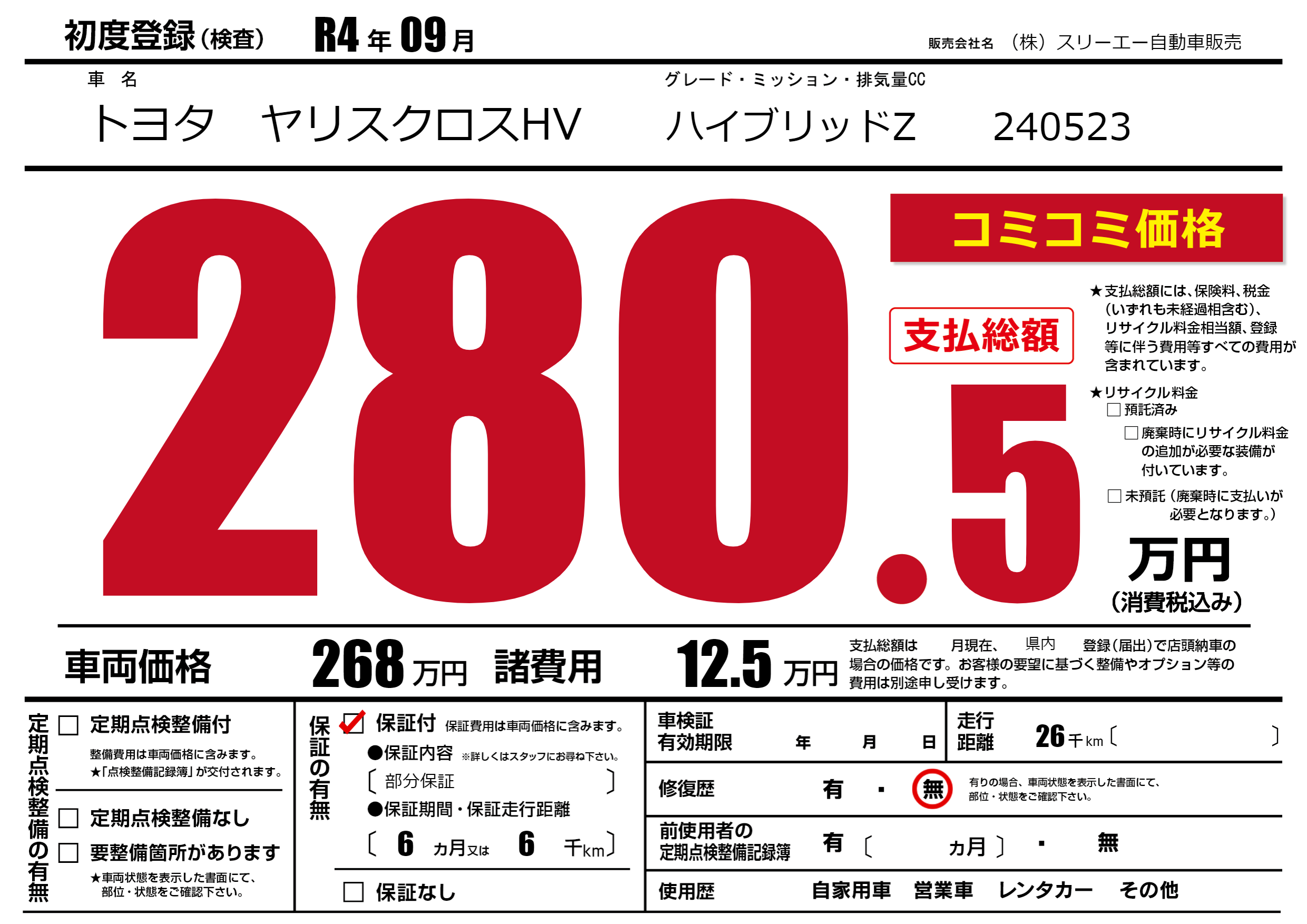 | 車名 | トヨタ ヤリスクロスHV | グレード ミッション 排気量 |