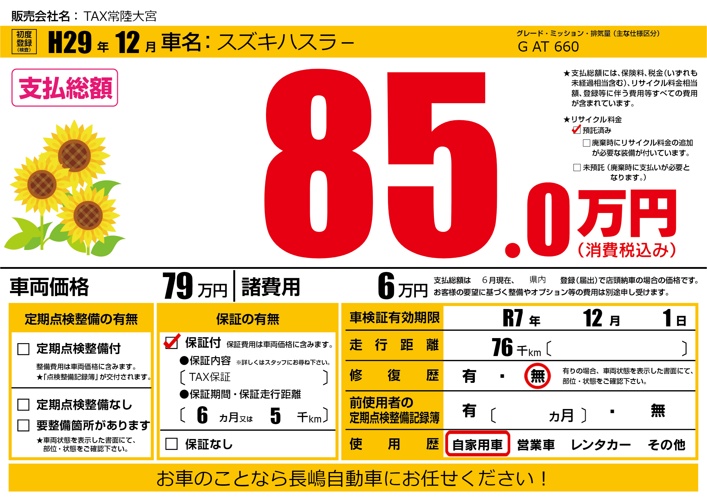 保証付き 保証内容(TAX保証) 6ヶ月または(5)千kmまで |