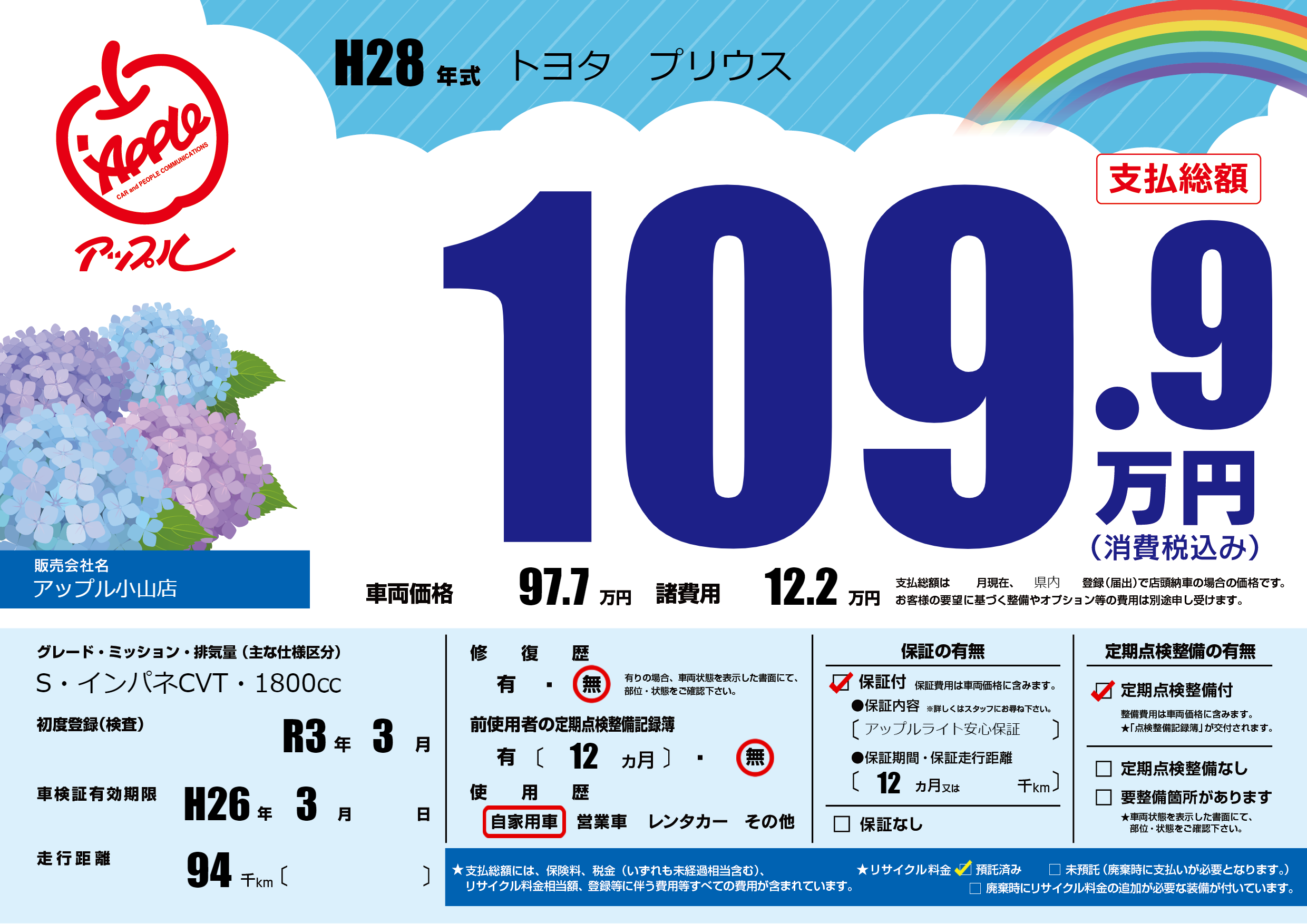 保証付き 保証内容(アップルライト安心保証) 12ヶ月または千km |