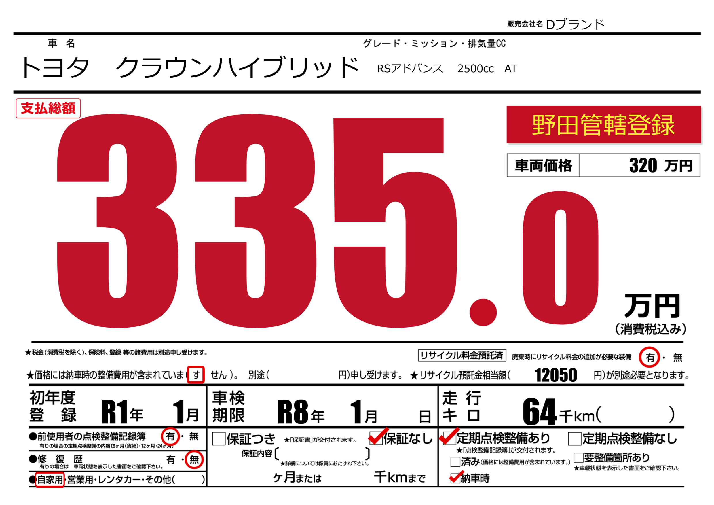 | 車名 | トヨタ クラウンハイブリッド | グレード ミッション 排気量 |