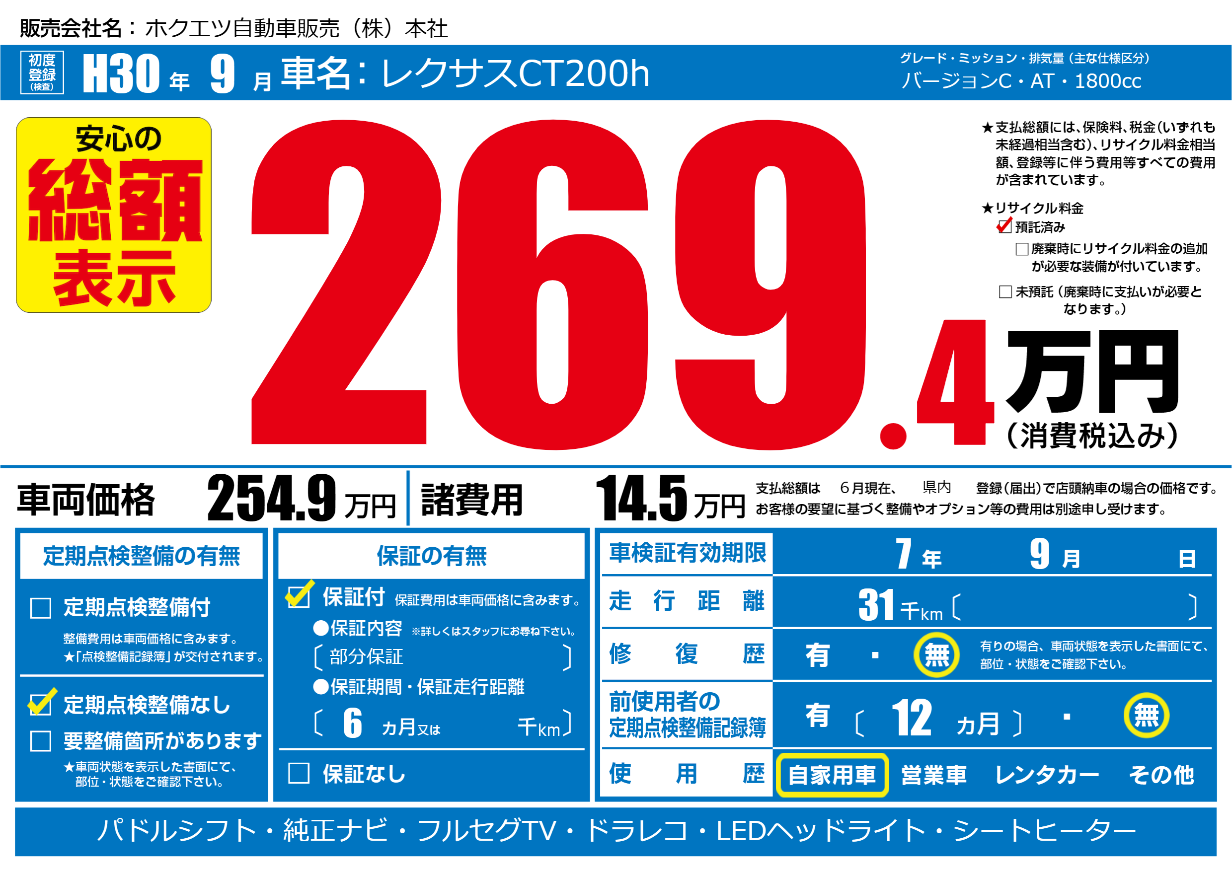 | 車名 | レクサスCT200h | グレード ミッション 排気量 |
