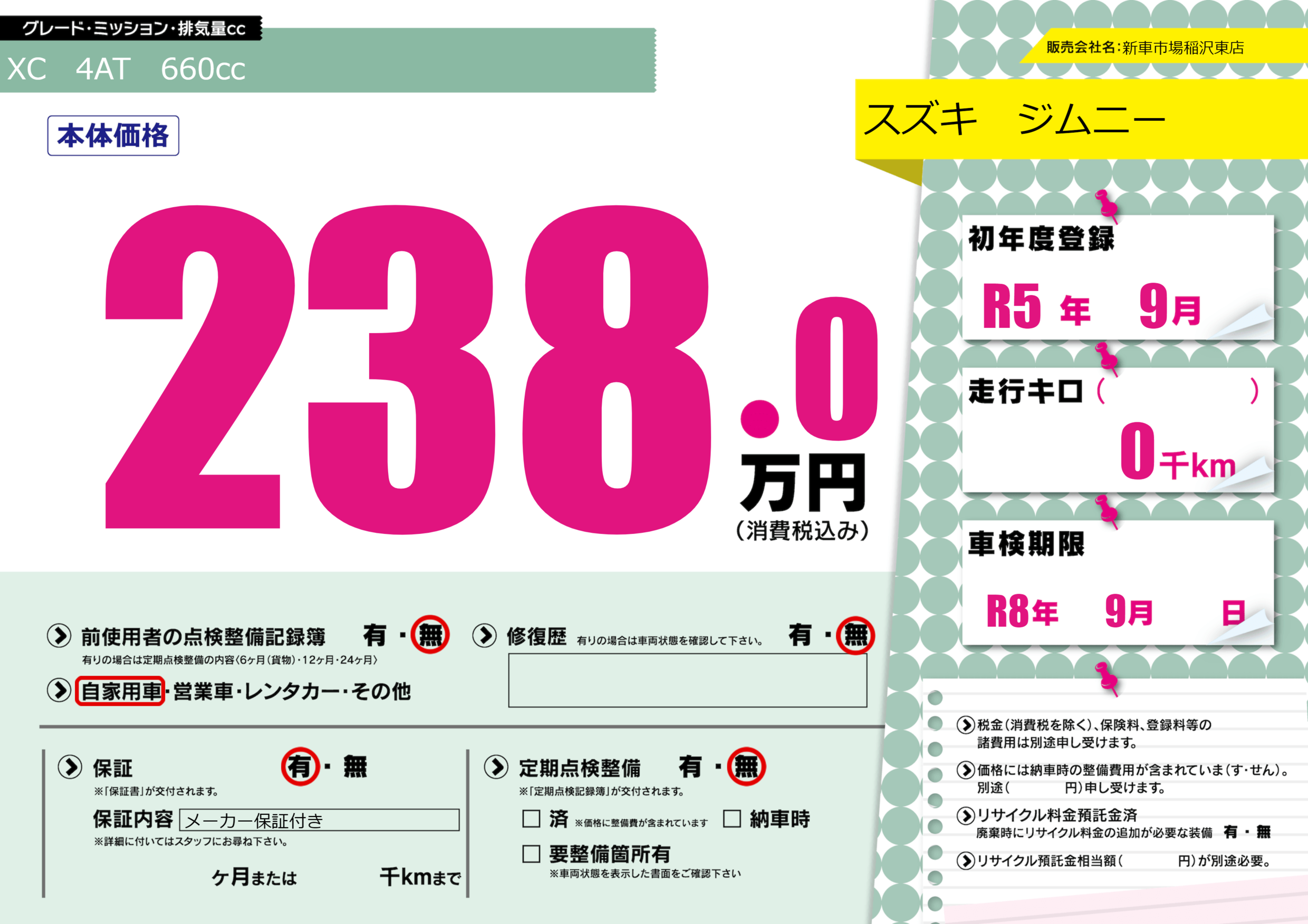 | 車名 | スズキ ジムニー | グレード ミッション 排気量 |