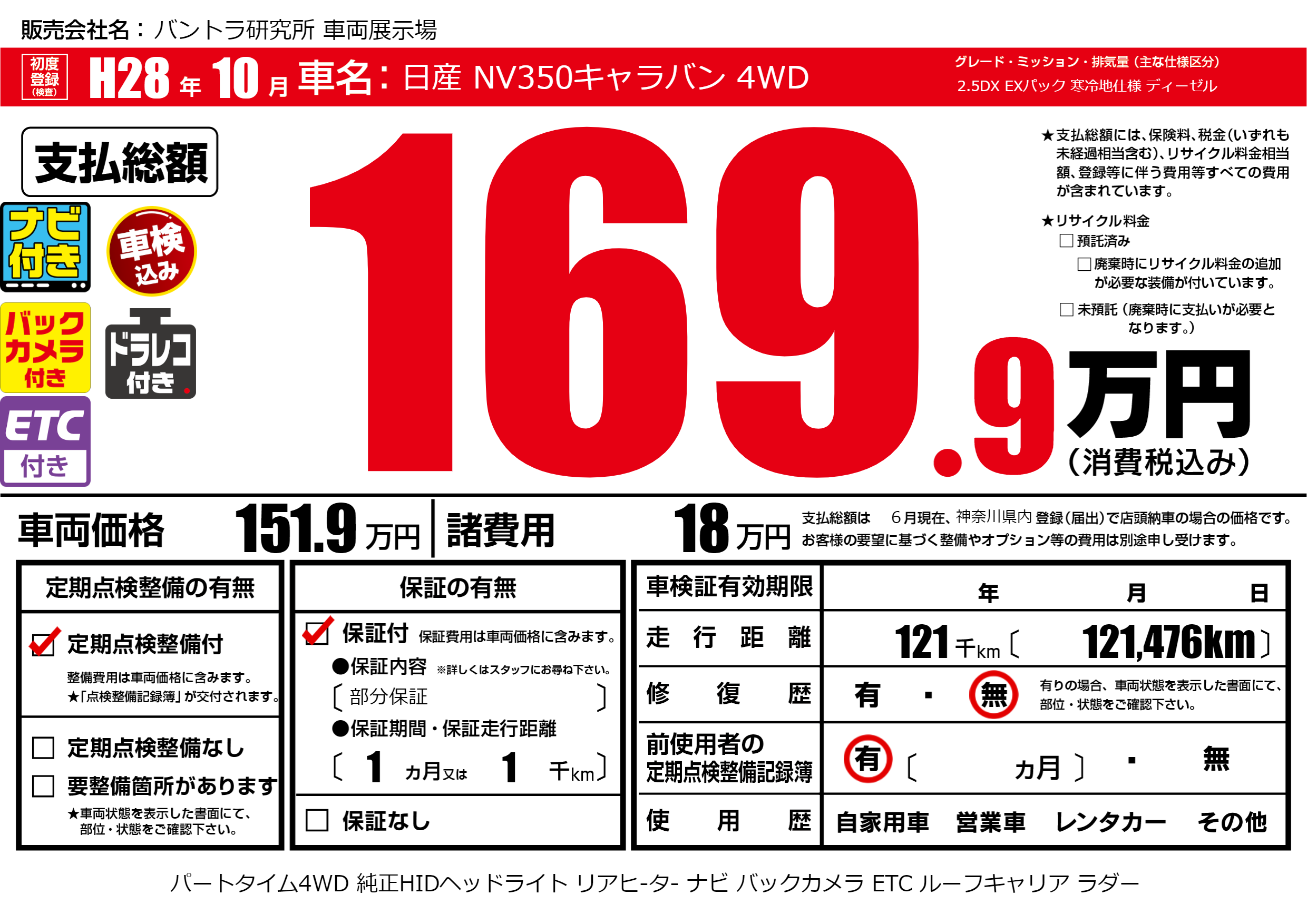 | 走行キロ | 12.1万km | 初年度登録 | H28年10月 |