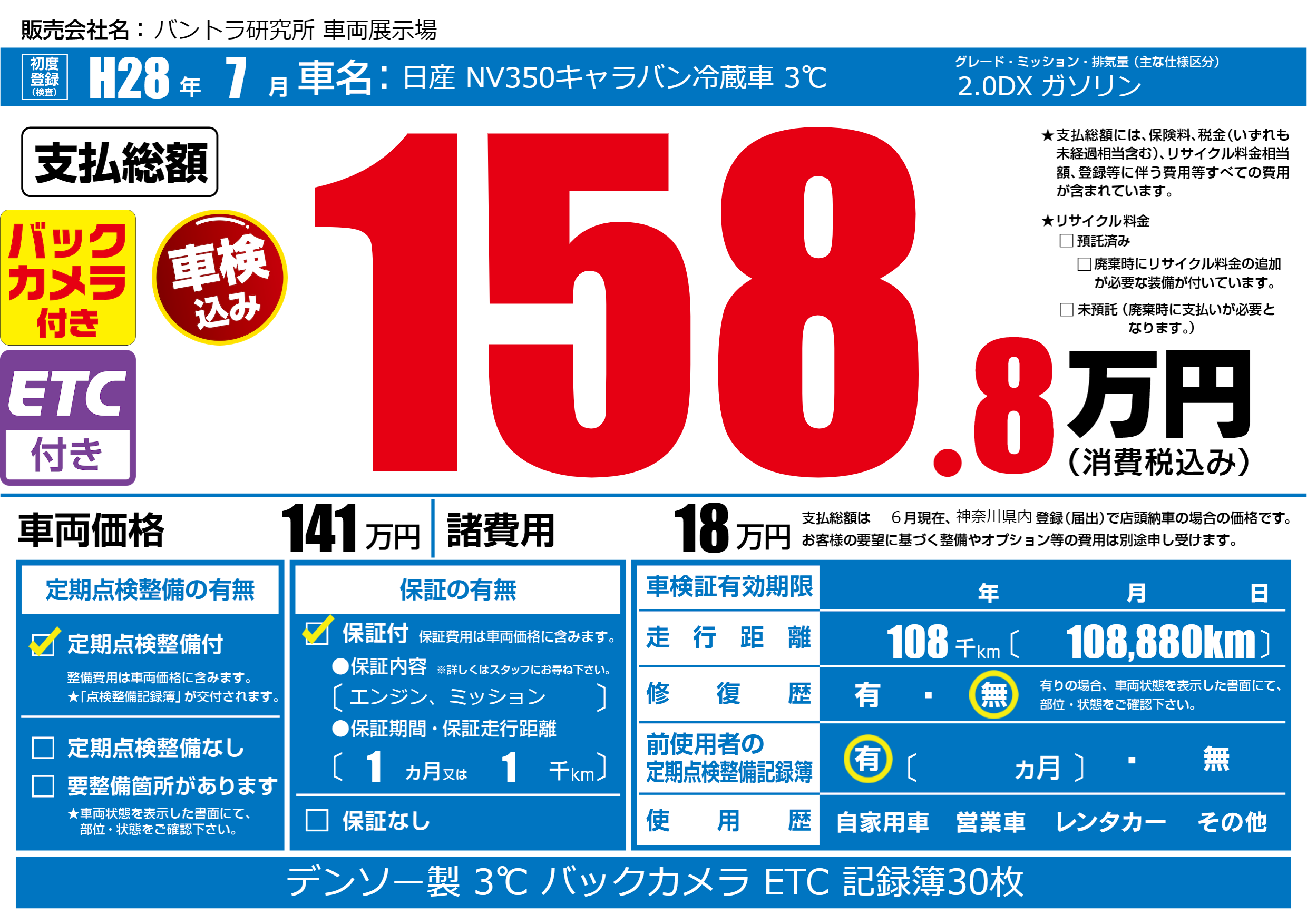| 走行キロ | 10.8万km | 初年度登録 | H28年7月 |