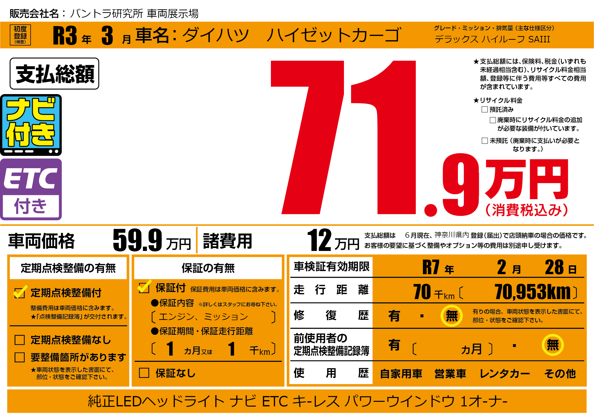 | 走行キロ | 7万km | 初年度登録 | R3年3月 |
