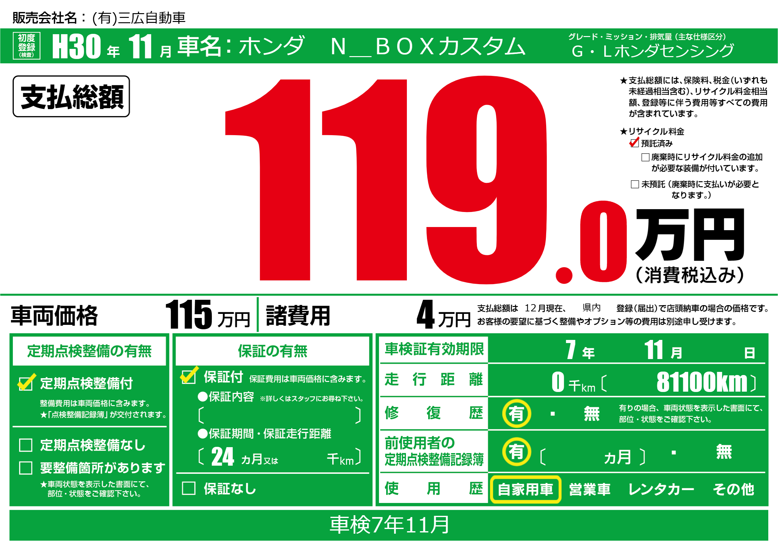 保証付き 保証内容(---) 24ヶ月または()千kmまで |