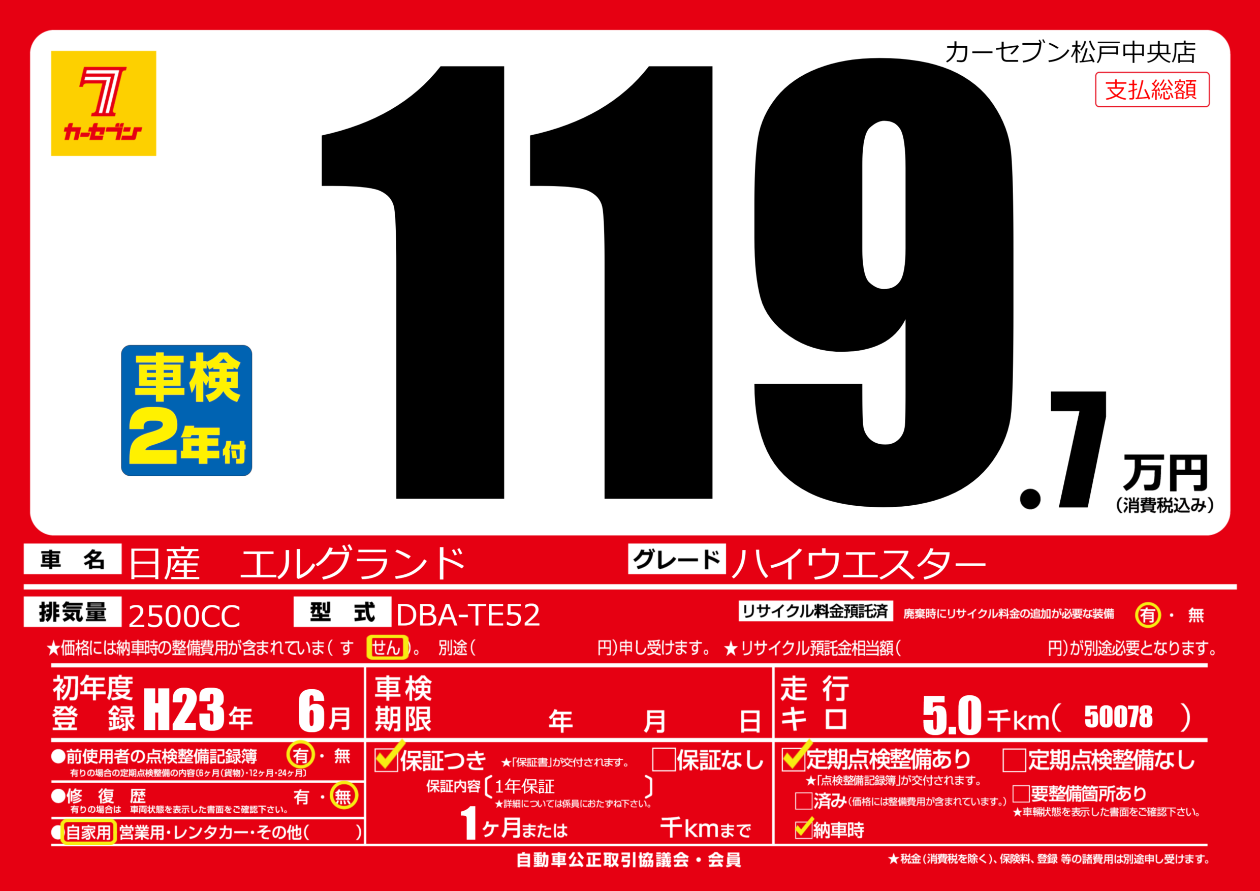 | 走行キロ | 0.5万km | 初年度登録 | H23年6月 |