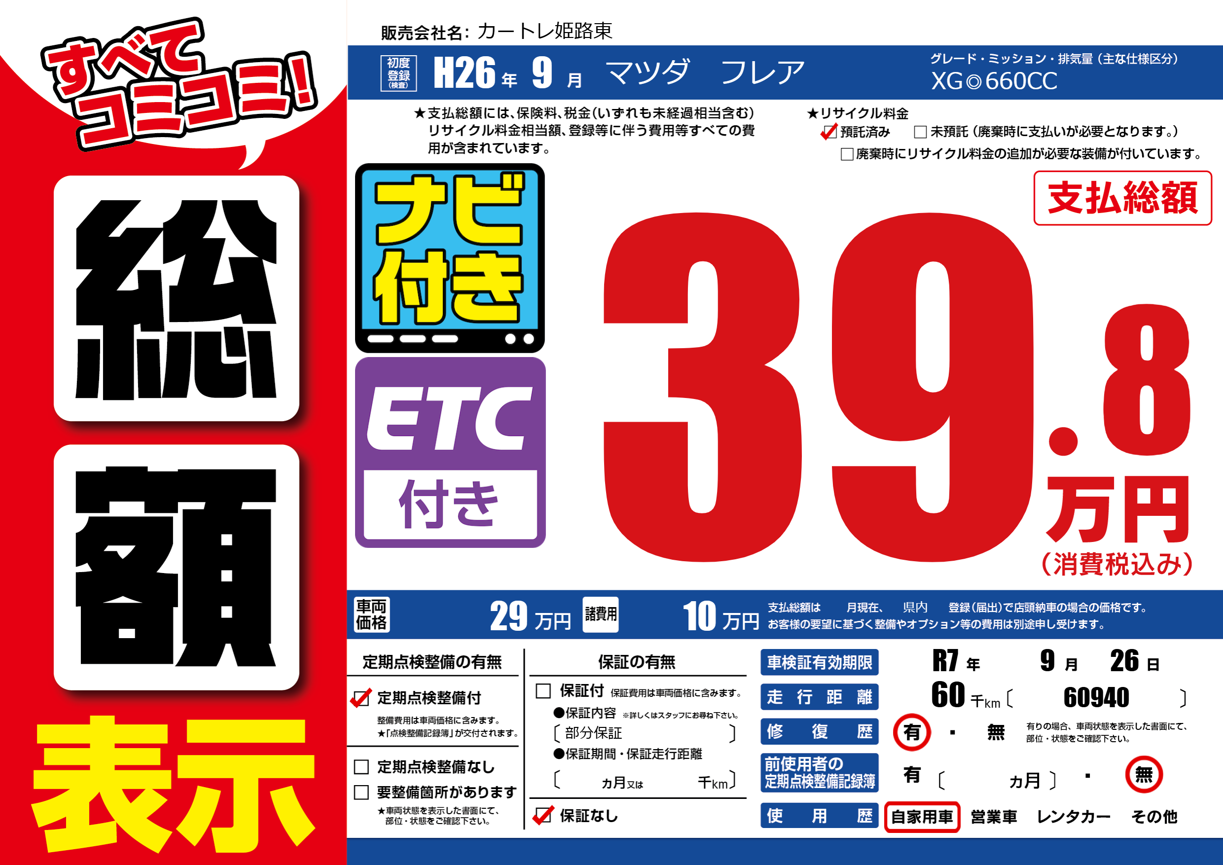 | 車名 | マツダ フレア | グレード ミッション 排気量 |