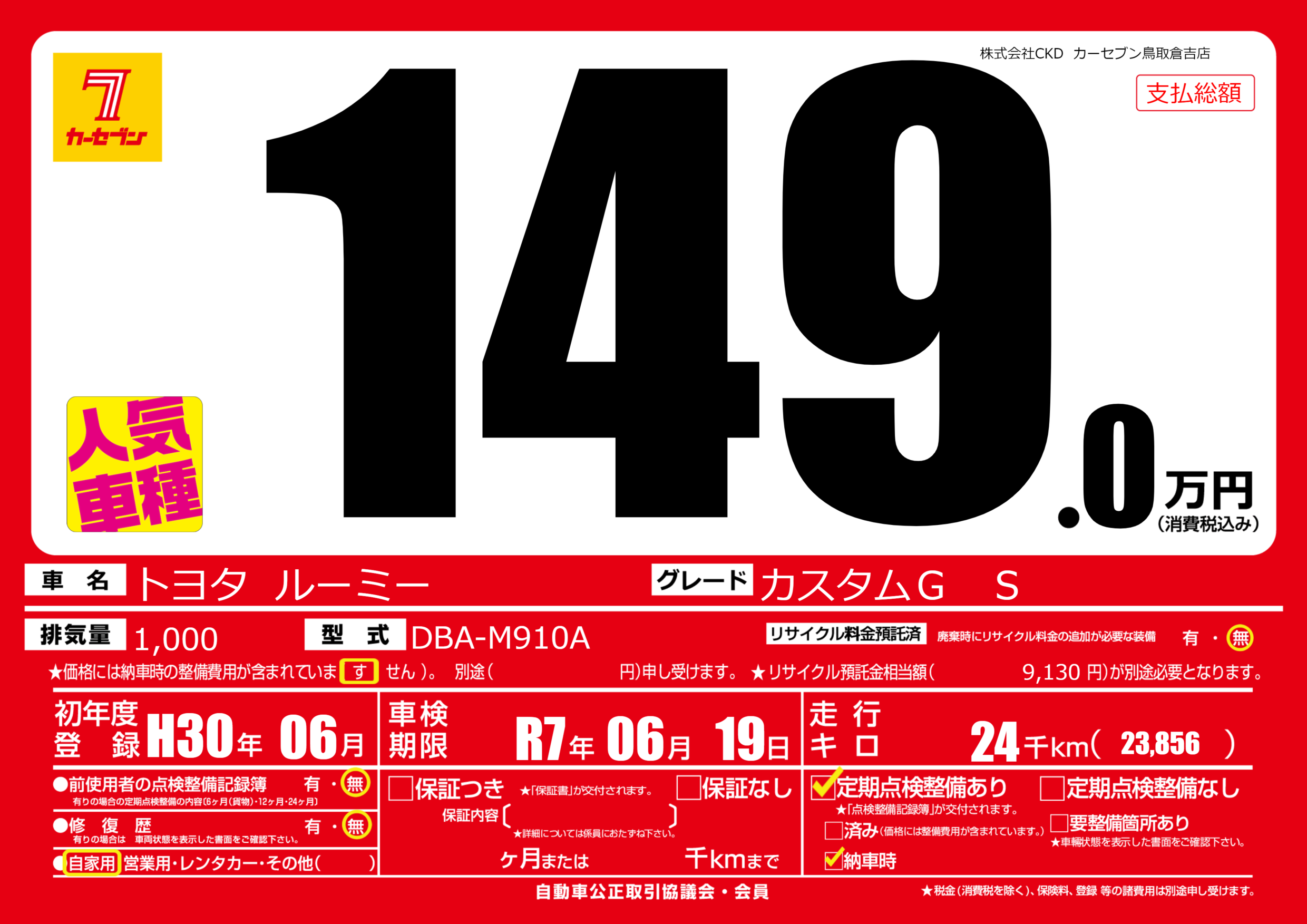 | 車名 | トヨタ ルーミー | グレード ミッション 排気量 |